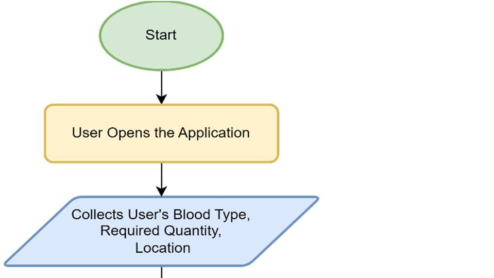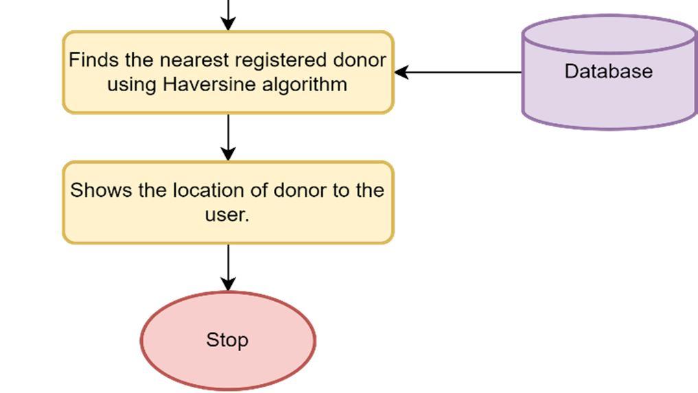 However, blood bank staff will also get an alert whenever the blood stock is low and the blood group which was specified by the user was not available. The blood bank will also get a notification whenever the blood is about to expire. Multiple users cannot access the application at a time as there will be any chance of delay in response from the server. After considering the required blood group as an input from the user the system will query the list of blood bags in a centralized database. The system receives a detailed list of nearby blood donors based on the user's location. The system then uses Haversine formula to calculate the distance between the user's location and the donor's location. The Distance is calculated by using the Google Maps API, by considering the user's location and the locations of various donors or blood banks. The system immediately processes this information and presents the user with donor or blood bank locations that satisfies the user's requirements. The system takes the user's GPS location as input to provide the location details of the nearest blood donor or blood bank. The user can obtain the required amount of blood from the specified site.