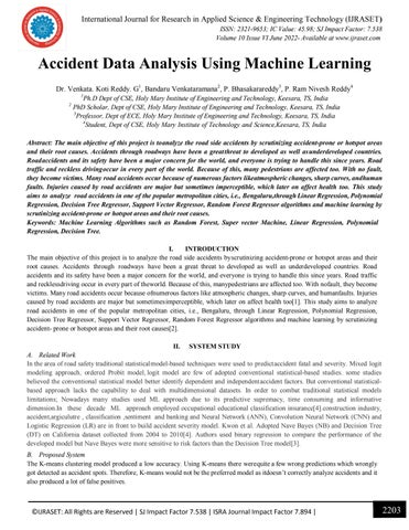 Abstract: The main objective of this project is to analyze the road side accidents by scrutinizing accident-prone or hotspot areas and their root causes. Accidents through roadways have been a great threat to developed as well as underdeveloped countries. Road accidents and its safety have been a major concern for the world, and everyone is trying to handle this since years. Road traffic and reckless driving occur in every part of the world. Because of this, many pedestrians are affected too. With no fault, they become victims. Many road accidents occur because of numerous factors likeatmospheric changes, sharp curves, andhuman faults. Injuries caused by road accidents are major but sometimes imperceptible, which later on affect health too. This study aims to analyze road accidents in one of the popular metropolitan cities, i.e., Bengaluru,through Linear Regression, Polynomial Regression, Decision Tree Regressor, Support Vector Regressor, Random Forest Regressor algorithms and machine learning by scrutinizing accident-prone or hotspot areas and their root causes. Keywords: Machine Learning Algorithms such as Random Forest, Super vector Machine, Linear Regression, Polynomial Regression, Decision Tree. I. INTRODUCTION The main objective of this project is to analyze the road side accidents by scrutinizing accident-prone or hotspot areas and their root causes. Accidents through roadways have been a great threat to developed as well as underdeveloped countries. Road accidents and its safety have been a major concern for the world, and everyone is trying to handle this since years. Road traffic and recklessdriving occur in every part of theworld. Because of this, manypedestrians are affected too. With nofault, they become victims. Many road accidents occur because ofnumerous factors like atmospheric changes, sharp curves, and humanfaults. Injuries caused by road accidents are major but sometimes imperceptible, which later on affect health too[1]. This study aims to analyze road accidents in one of the popular metropolitan cities, i.e., Bengaluru, through Linear Regression, Polynomial Regression, Decision Tree Regressor, Support Vector Regressor, Random Forest Regressor algorithms and machine learning by scrutinizing accident- prone or hotspot areas and their root causes[2]. II. SYSTEM STUDY A. Related Work In the area of road safety traditional statistical model-based techniques were used to predict accident fatal and severity. Mixed logit modeling approach, ordered Probit model, logit model are few of adopted conventional statistical-based studies. some studies believed the conventional statistical model better identify dependent and independent accident factors. But conventional statisticalbased approach lacks the capability to deal with multidimensional datasets. In order to combat traditional statistical models limitations; Nowadays many studies used ML approach due to its predictive supremacy, time consuming and informative dimension.In these decade ML approach employed occupational educational classification insurance[4].construction industry, accident,argiculutre , classification ,sentiment and banking and Neural Network (ANN), Convolution Neural Network (CNN) and Logistic Regression (LR) are in front to build accident severity model. Kwon et al. Adopted Nave Bayes (NB) and Decision Tree (DT) on California dataset collected from 2004 to 2010[4]. Authors used binary regression to compare the performance of the developed model but Nave Bayes were more sensitive to risk factors than the Decision Tree model[3]. B. Proposed System The K-means clustering model produced a low accuracy. Using K-means there were quite a few wrong predictions which wrongly got detected as accident spots. Therefore, K-means would not be the preferred model as itdoesn’t correctly analyze accidents and it also produced a lot of false positives.