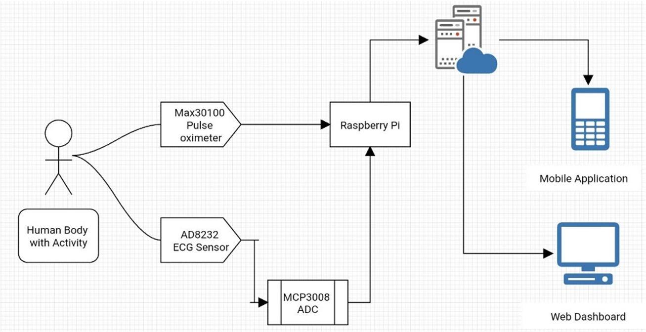 The AD8232 is a sensor that is used to measure the ECG of the patient. The sensor works by measuring the electrical activity of the heart. The data from the sensor is then used to calculate the heart rate of the patient. As the AD8232 outputs only the analog data it was not compatible with the Raspberry Pi 3b+. This required a new module, MCP3008, an analog to digital converter to convert the analog data and transfer it to the Raspberry Pi using the SPI interface. The data from the sensors is processed by the Raspberry Pi 3b+. The Data coming from the ECG machine is first validated by the pins LO and LO+ for correction of erroneous data while the implementation of the MAX30100 sensor uses an average of values and max to handle outliers in the data and filter them out.