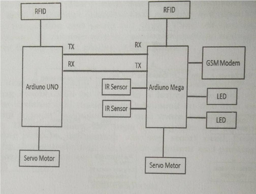 The system consists if RFID module, GSM modem infrared sensor module, servo meter, Arduino mega. This system setup is show in figure: