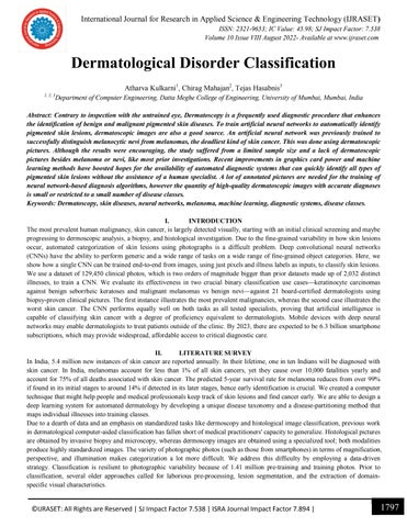 International Journal for Research in Applied Science & Engineering Technology (IJRASET) ISSN: 2321 9653; IC Value: 45.98; SJ Impact Factor: 7.538 Volume 10 Issue VIII August 2022 Available at www.ijraset.com 1797©IJRASET: All Rights are Reserved | SJ Impact Factor 7.538 | ISRA Journal Impact Factor 7.894 | Dermatological Disorder Classification