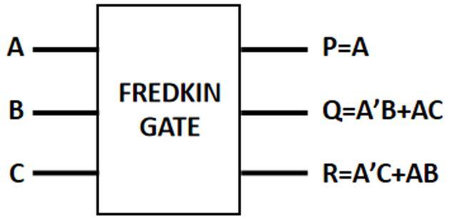 Fig 4 shows a 3*3 Fredkin gate. The input vector is I (A, B, C) and the output vector is O (P, Q, R). The output is defined by P=A, Q=A′B xor AC and R=A′C xor AB. Quantum cost of a Fredkin gate is 5