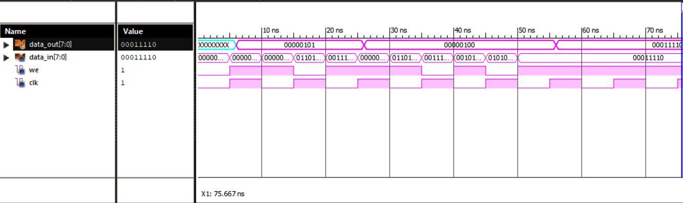 The waveform of CAN register module is shown in Fig.5 and the corresponding console was obtained. From the simulation result, we can see the output of Register module for given 8 bit inputs. Hence, the obtained output matches expected output. Register data are used as variables in procedural blocks. They store logic values only. Here it is disguised as the given input data and the obtained output data are same. For every 5 seconds the input signals data has been changed and the corresponding output data signals have been achieved accordingly. The register elements cannot be connected to the output port of a module instantiation.