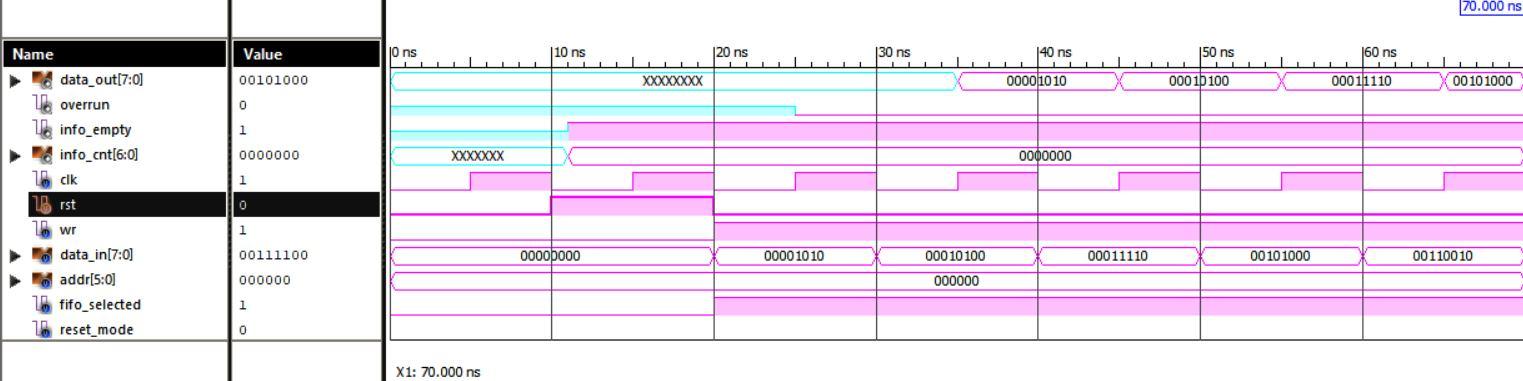 The CAN controller core was simulated after the synthesis was completed. A testbench was used to model the configuration of the CAN controller. A testbench is a hierarchical top level model that instantiates a desired model, the system under test, and other variables. The model is driven by a collection of test vectors, and the model's responses are generated. The testbench created a CAN controller core and then constructed a CAN message with one data byte for the purposes of this thesis. The messages were then sent out, and the CAN controller received them, which were then placed in the receive queue. FIFO has been debated. The following preliminary findings were obtained using the ISE design suite environment. A CAN node transmits a message in its configuration with the receiver line connected to the transmitter line to enable self reception of the transmitted message. This simulation will measure the function of the CAN node.