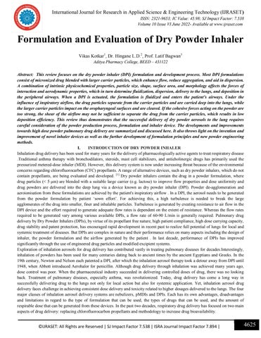Formulation and Evaluation of Dry Powder Inhaler Vikas Kotkar1, Dr. Hingane L.D.2, Prof. Latif Bagwan3 Aditya Pharmacy College, BEED – 431122 Abstract: This review focuses on the dry powder inhaler (DPI) formulation and development process. Most DPI formulations consist of micronized drug blended with larger carrier particles, which enhance flow, reduce aggregation, and aid in dispersion. A combination of intrinsic physicochemical properties, particle size, shape, surface area, and morphology affects the forces of interaction and aerodynamic properties, which in turn determine fluidization, dispersion, delivery to the lungs, and deposition in the peripheral airways. When a DPI is actuated, the formulation is fluidized and enters the patient’s airways. Under the influence of inspiratory airflow, the drug particles separate from the carrier particles and are carried deep into the lungs, while the larger carrier particles impact on the oropharyngeal surfaces and are cleared. If the cohesive forces acting on the powder are too strong, the shear of the airflow may not be sufficient to separate the drug from the carrier particles, which results in low deposition efficiency. This review thus demonstrates that the successful delivery of dry powder aerosols to the lung requires careful consideration of the powder production process, formulation and inhaler device. The developments and improvements towards high dose powder pulmonary drug delivery are summarized and discussed here. It also throws light on the invention and improvement of novel inhaler devices as well as the further development of formulation principles and new powder engineering methods. I. INTRODUCTION OF DRY POWDER INHALER Inhalation drug delivery has been used for many years for the delivery of pharmacologically active agents to treat respiratory disease .Traditional asthma therapy with bronchodilators, steroids, mast cell stabilizers, and anticholinergic drugs has primarily used the pressurized metered-dose inhaler (MDI). However, this delivery system is now under increasing threat because of the environmental concerns regarding chlorofluorocarbon (CFC) propellants. A range of alternative devices, such as dry powder inhalers, which do not contain propellants, are being evaluated and developed. [1] Dry powder inhalers contain the drug in a powder formulation, where drug particles (< 5 μm) are blended with a suitable large carrier (e.g. lactose) to improve flow properties and dose uniformity and drug powders are delivered into the deep lung via a device known as dry powder inhaler (DPI). Powder de-agglomeration and aeroionisation from these formulations are achieved by the patient's inspiratory airflow . In a DPI, the aerosol needs to be generated from the powder formulation by patient ‘sown effort’. For achieving this, a high turbulence is needed to break the large agglomerates of the drug into smaller, finer and inhalable particles. Turbulence is generated by creating resistance to air flow in the DPI device and the effort required to generate adequate flow rates is dependent on the extent of resistance. Whereas the flow rates required to be generated vary among various available DPIs, a flow rate of 60-90 L/min is generally required. Pulmonary drug delivery by Dry Powder Inhalers (DPIs), by virtue of its propellant free nature, high patient compliance, high dose carrying capacity, drug stability and patent protection, has encouraged rapid development in recent past to realize full potential of lungs for local and systemic treatment of diseases. But DPIs are complex in nature and their performance relies on many aspects including the design of inhaler, the powder formulation and the airflow generated by the patient . In last decade, performance of DPIs has improved significantly through the use of engineered drug particles and modified excipient systems. Exploration of inhalation aerosols for drug delivery has contributed vastly in treating pulmonary diseases for decades.Interestingly, inhalation of powders has been used for many centuries dating back to ancient times by the ancient Egyptians and Greeks. In the 19th century, Newton and Nelson each patented a DPI, after which the inhalation aerosol therapy took a detour away from DPI until 1948, when Abbott introduced Aerohalor for penicillin. Although drug delivery through inhalation was achieved many years ago, dose control was poor. When the pharmaceutical industry succeeded in delivering controlled doses of drug, there was no looking back. Treatment of pulmonary diseases, especially asthma, was revolutionized. Today, drug delivery has come a long way in successfully delivering drug to the lungs not only for local action but also for systemic application. Yet, inhalation aerosol drug delivery faces challenge in achieving consistent dose delivery and toxicity related to higher dosages delivered to the lungs. The four major classes of inhalation aerosol delivery systems are nebulizers, pMDIs and DPIs. Each has its own advantages, disadvantages and limitations in regard to the type of formulation that can be used, the types of drugs that can be used, and the amount of respirable dose that can be generated from these devices. In the past two decades, respiratory drug delivery has focused on two main aspects of drug delivery: replacing chlorofluorocarbon propellants and methodology to increase drug bioavailability.