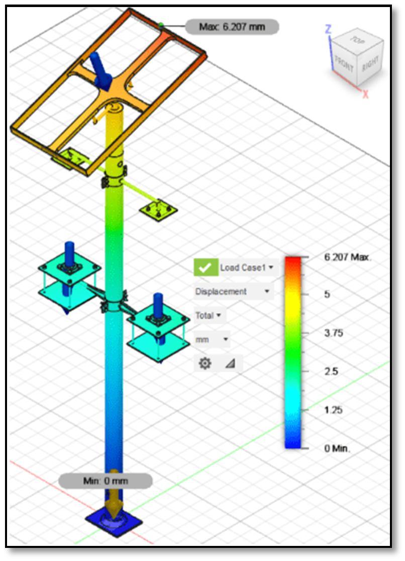 When the external loads are applied the maximum displacement that occurred in the design is 6.207 mm which is very minimal in practical life and the least displacement we can observe as 0mm. We can observe that due to the PV panel weight the panel holder has maximum displacement as we go down the design, we can observe the displacement decreases. At upper hand level the displacement is around 3-4 mm. At lower hand level the displacement is around 1-2 mm and at bottom of the pole the displacement is nearly 0mm. The turbine is placed in between the upper hand and lower hand; this small displacement near both the hands may not affect the movement of the turbine.