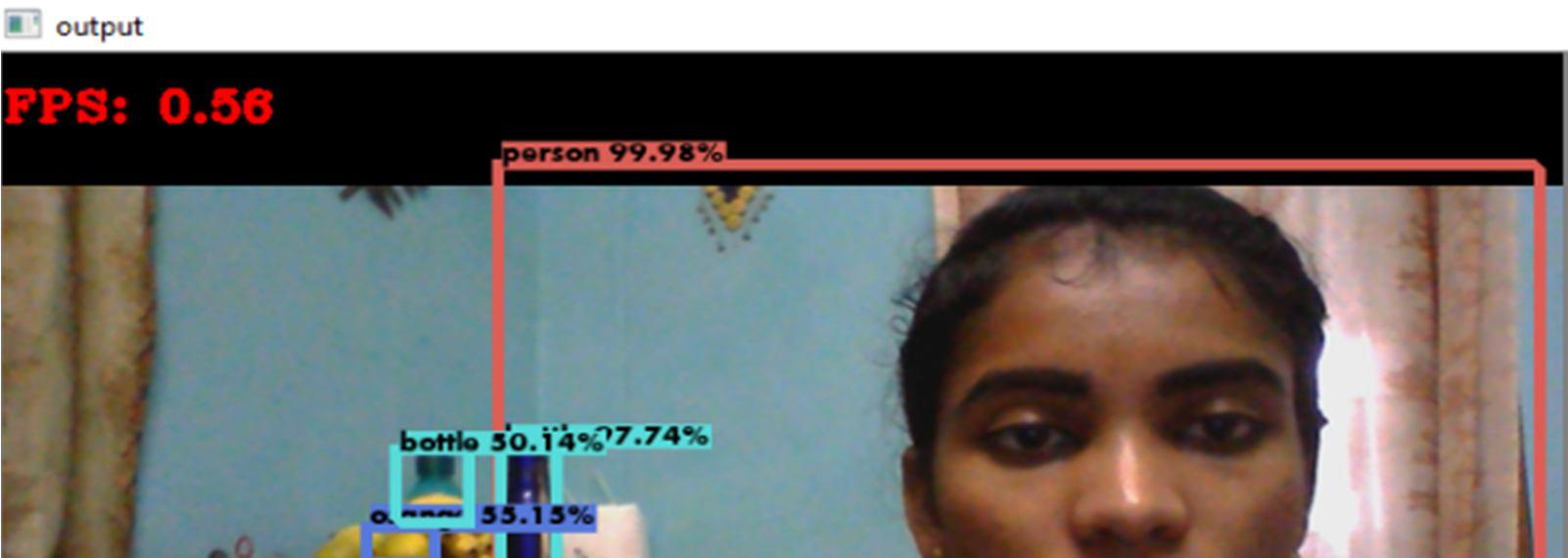 It captures the accuracy of a live video as it appears on the screen and verifies while sensing and shows the values of an accurate given by the images as displayed on the video like persons,bottle,fruits(oranges) with accuracy of 99.81%, 85%, 93.59% depends the captured data