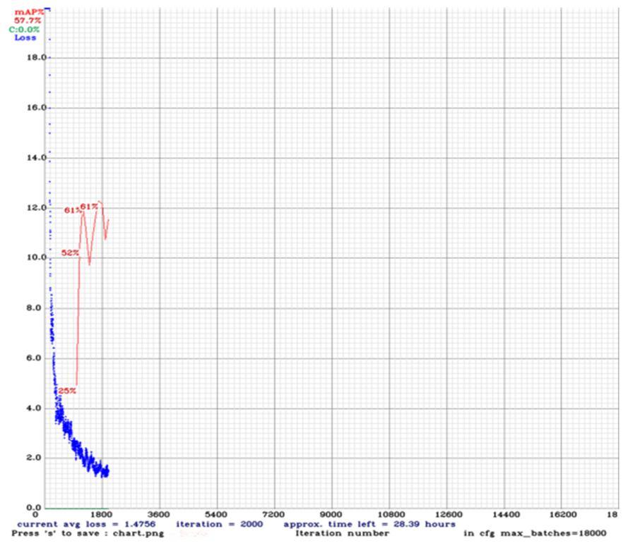 Using 5,000 images as 6 types of garbage objects for training and 500 images for testing, it is found that when the number of iterations is between 0 and 200, the CIOU loss decreases significantly, and the accuracy improves significantly. From 800 to 1200, its training performance gradually stabilized, and the MAP value eventually reached 61% when the iteration came to 1800. The YOLOV4 training loss value is shown in Figure 2. The trained model is used to detect the garbage and its category. The detection result is shown in Figure 3. From the figure, it can be seen that the model not only detects the garbage object but also detects the garbage category.