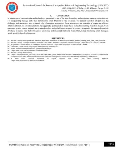 International Journal for Research in Applied Science & Engineering Technology (IJRASET) ISSN: 2321-9653; IC Value: 45.98; SJ Impact Factor: 7.538 Volume 10 Issue VI June 2022- Available at www.ijraset.com V. CONCLUSION In today's age of communication and technology, spam email is one of the most demanding and unpleasant concerns on the internet. For safeguarding message and e-mail transmission, spam detection is very necessary. The accurate detection of spam is a big challenge, and researchers have proposed a lot of detection approaches. These approaches, are incapable of proper and efficient detection of spam. To solve this problem, we suggested a spam detection model based on machine learning prediction models.When compared to other current methods, the proposed method attained a high accuracy of 96 percent. As a result, the suggested system is structured in such a way that it recognises unsolicited and undesired mails and blocks them, hence minimising spam messages, which would be beneficial to people. REFERENCES [1] [2] [3] [4] [5] [6] [7] [8] [9]