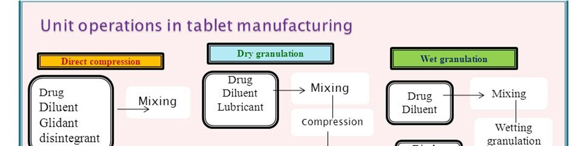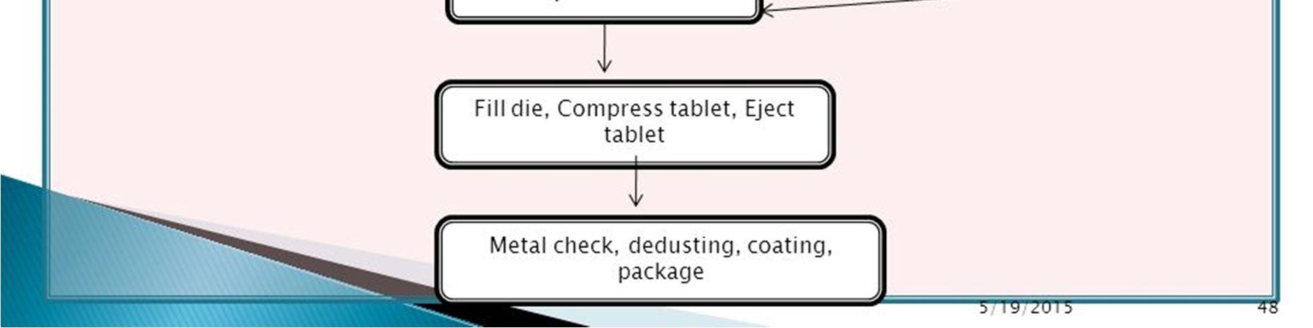 It involves direct compressing of powdered mixture into the tablets. Direct compression process consists of three steps like raw material blending, tableting and coating. This method is useful for developing particle size uniformly. Ex: Aspirin