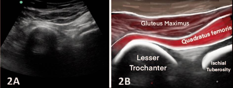 Figures 2A and 2B. Long Axis View. The quadratus femoris originates from the deep surface of the ischium and the inferior border of the semimembranosus, inserting on the intertrochanteric crest. Beneath the quadratus femoris lies the obturator externus, while the gluteus maximus is positioned above it. When performing the exam, identify the hyperechoic outline of the medial cortex of the lesser trochanter and the lateral cortex of the ischial tuberosity. The space between these two landmarks can be dynamically adjusted, narrowing or widening as described above.