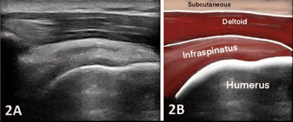 Figures 2A and 2B Short Axis View: Look for the bony cortex of the humeral head initially and the parallel fibers of the infraspinatus tendon as it inserts on the lateral facet of the greater tuberosity. The mild indention noted in the middle of the bony cortex represents the anatomical neck. The infraspinatus tendon lies on the humeral head and maintains a uniform appearance. Note that the tendon will exhibit a hyperechoic brightness.Identify the humeral head, the hyaline cartilage (seen as an anechoic interface above the cortex), the hyperechoic infraspinatus tendon, and its anechoic insertion onto the lateral facet of the greater tuberosity. This insertion typically has a larger anechoic footprint at its distal insertion, which should not be mistaken for pathology. Superior to the tendon is the anechoic space for the bursa, typically visible in nonpathological infraspinatus tendons. Above the tendon and bursa, you will see the deltoid muscle and the subcutaneous fat tissue at the top of the image.