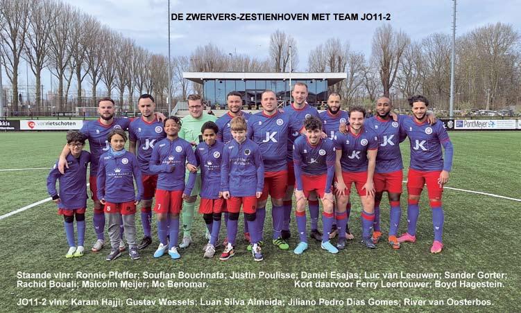 via de rechterkant weer op en scoort de 1-3. Als Zestienhoven gas geeft in deze fase dan is er geen houden meer aan. De Zwervers komt er sporadisch uit en de tegenstootjes zijn niet echt heel gevaarlijk. Ook moet Justin Poulisse met de voet weer een grote kans voor Zestienhoven onschadelijk maken anders had het al een onoverbrugbare score geweest. In de slotfase van de eerste helft wordt het toch 2-3 door een eigen doelpunt, een verdediger wil terug koppen op de keeper, maar de keeper is uitgelopen, zodat de bal over hem heen in het doel verdwijnt: 2-3.