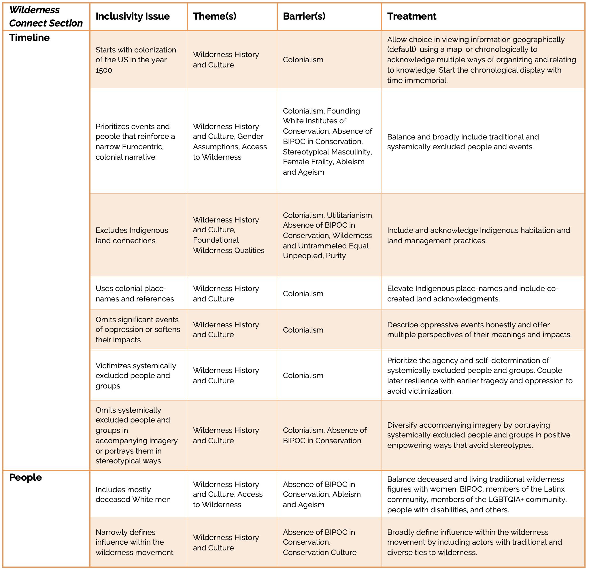400,000 people (Google 2022) learn about wilderness annually. The evaluated content included a wilderness history timeline, a list of influential figures in the wilderness movement, and a biography of John Muir. The review committee evaluated this content both before and after proposed inclusive language editing. However, the review committee agreed after this initial evaluation that the committee’s scope required expansion to include a more detailed cataloging of exclusive communications elements, both in language and concept. Creating such a catalog could then guide future rewriting of interpretive content. The review committee agreed that identifying exclusionary elements of wilderness was a prerequisite to further developing a common understanding around challenges within wilderness communications. Thus, the themes that follow from the reflective assessment represent this important prerequisite step.
