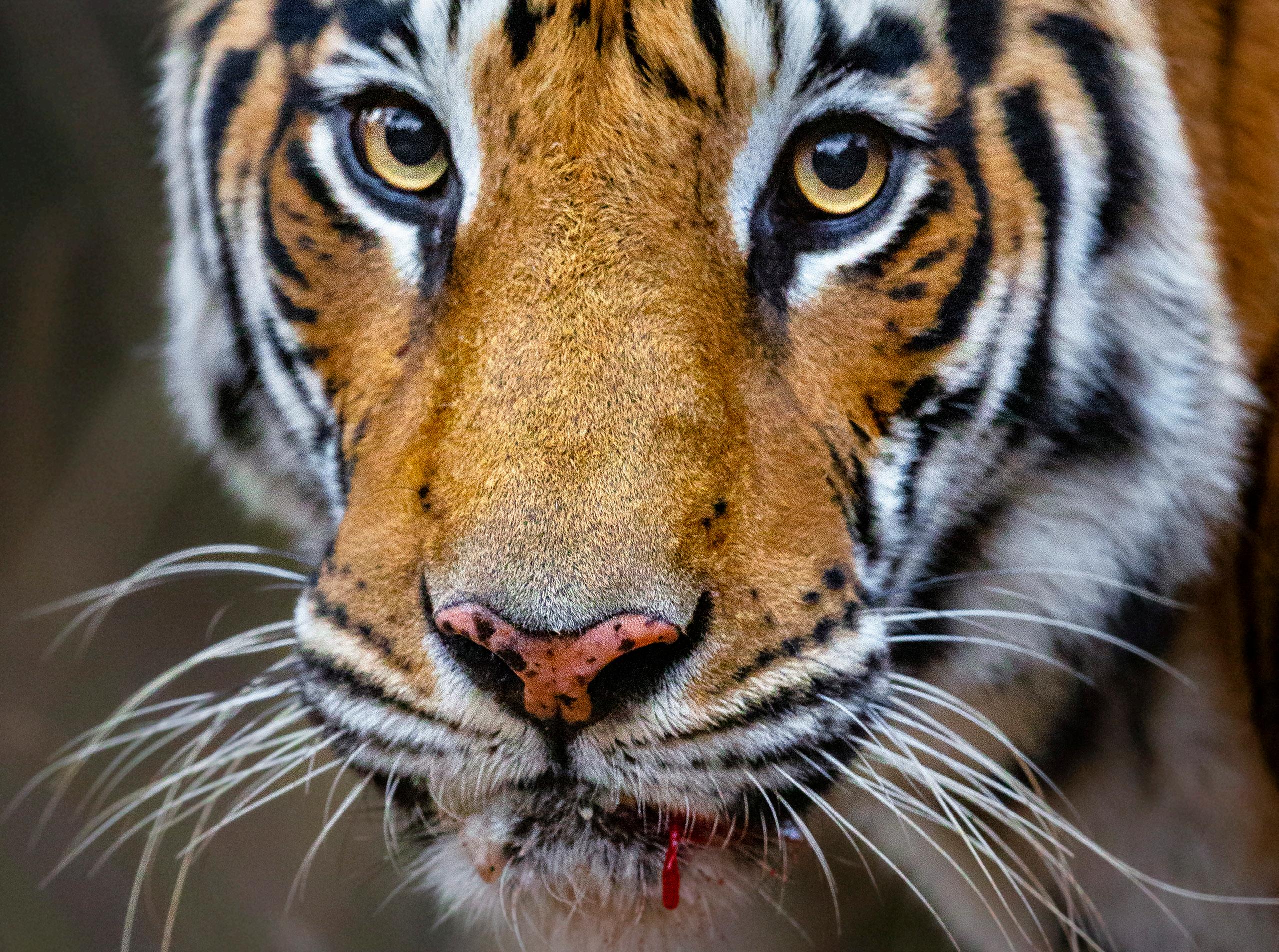 starving – her chest flapped open, and she was bleeding from her mouth, hind legs, paws, and shoulders. I feared for her survival and that of her cubs. She came and stood just a couple meters from my jeep and gazed at me with her amber eyes as if wanting to say something. Her eyes looked full of pain and distress. That is the moment captured on this large portrait of Solo. I have seen tigers thousands of times, spent countless hours with them, and know many of them very intimately, but never had I ever felt such a boundless and inseparable connection as I felt in that moment with Solo. A day later, Solo was tranquilized by the Forest Department, and her wounds were stitched up. Solo survived. And so did her cubs. Solo was a fighter.