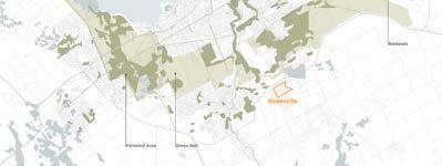 Ottawa's urban boundary, 2021, has beeen expanded to include the area around the new O-Train station at Bowesville. In an area comprising 450ha, with a minimum density target of 120 uph within 400m radius from the transit station. Designers were tasked with masterplanning a transit oriented, climate conscious suburb that improved the standards of living for all residents.