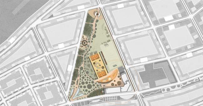 The park is designed around a central trail that guides users through all activites while allowing for a scenic views between destinations. It is built to cater to Carleton University students/employees as well as Confederation heights resident families. It reinvigorates unused NCC park land while maximizing its commercial potential. The park serves as the introduction into the urban neighbourhood. It connects to the surrounding park area and directly leads into the neihbnourhoods commercial pedestrian main street.