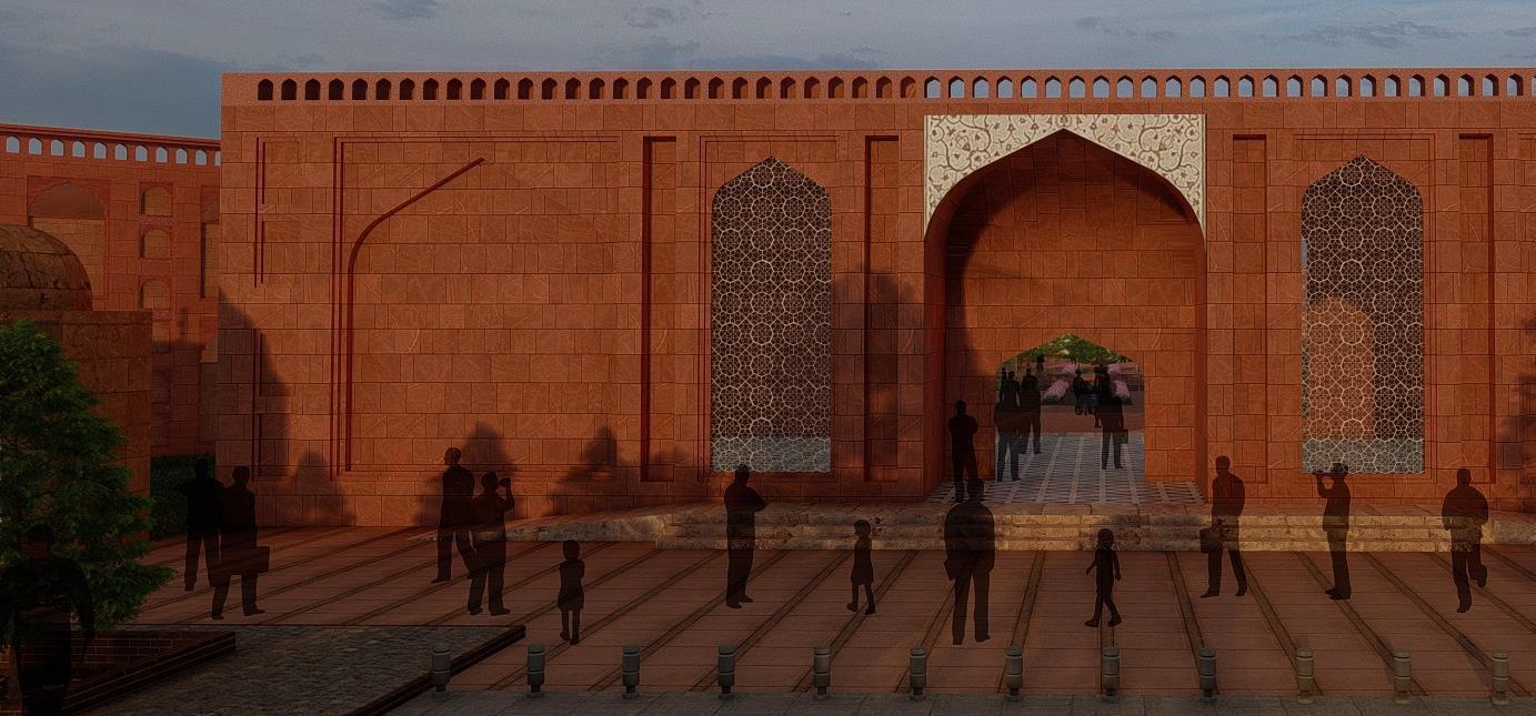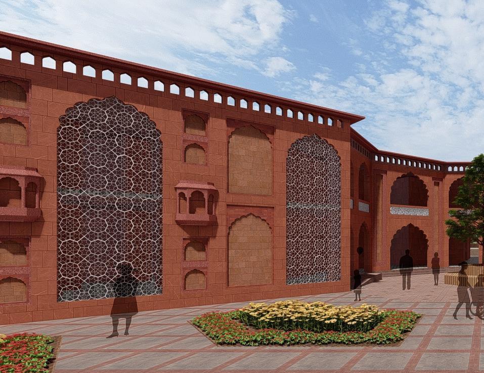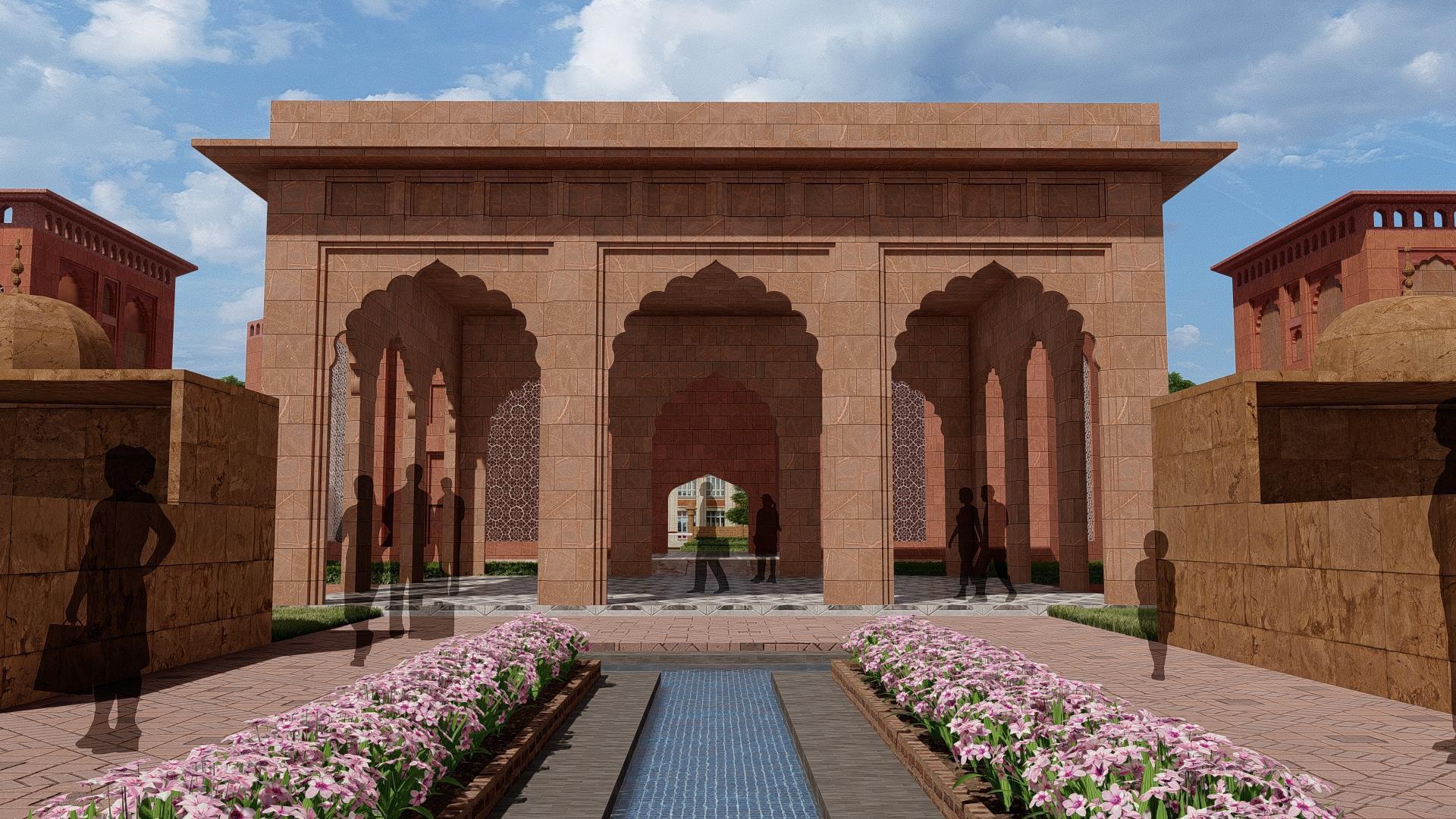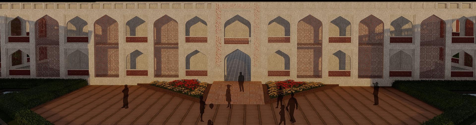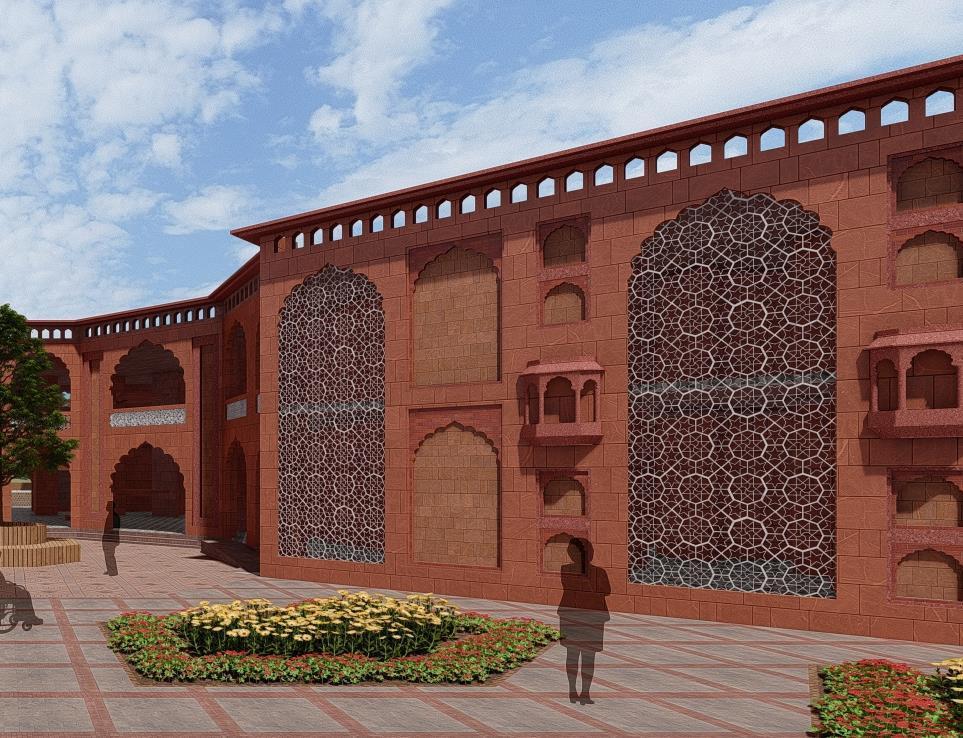 Recreational centre has been designed along with essential cultural site by introducing Mughal elements and it's composition showing it's principle of balance & symmetry with geometric patterns.