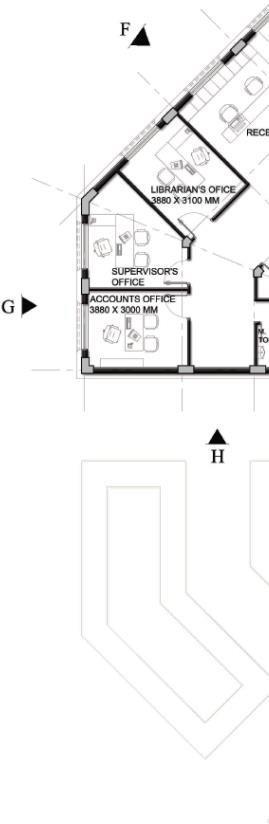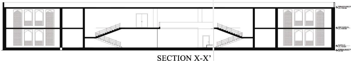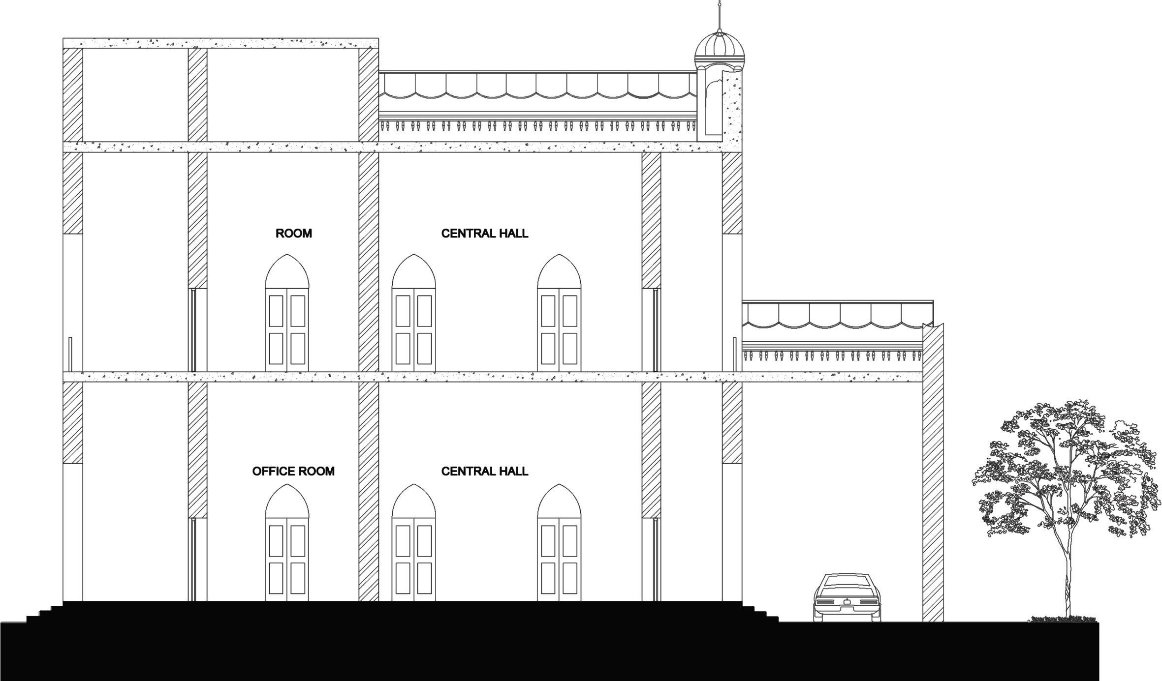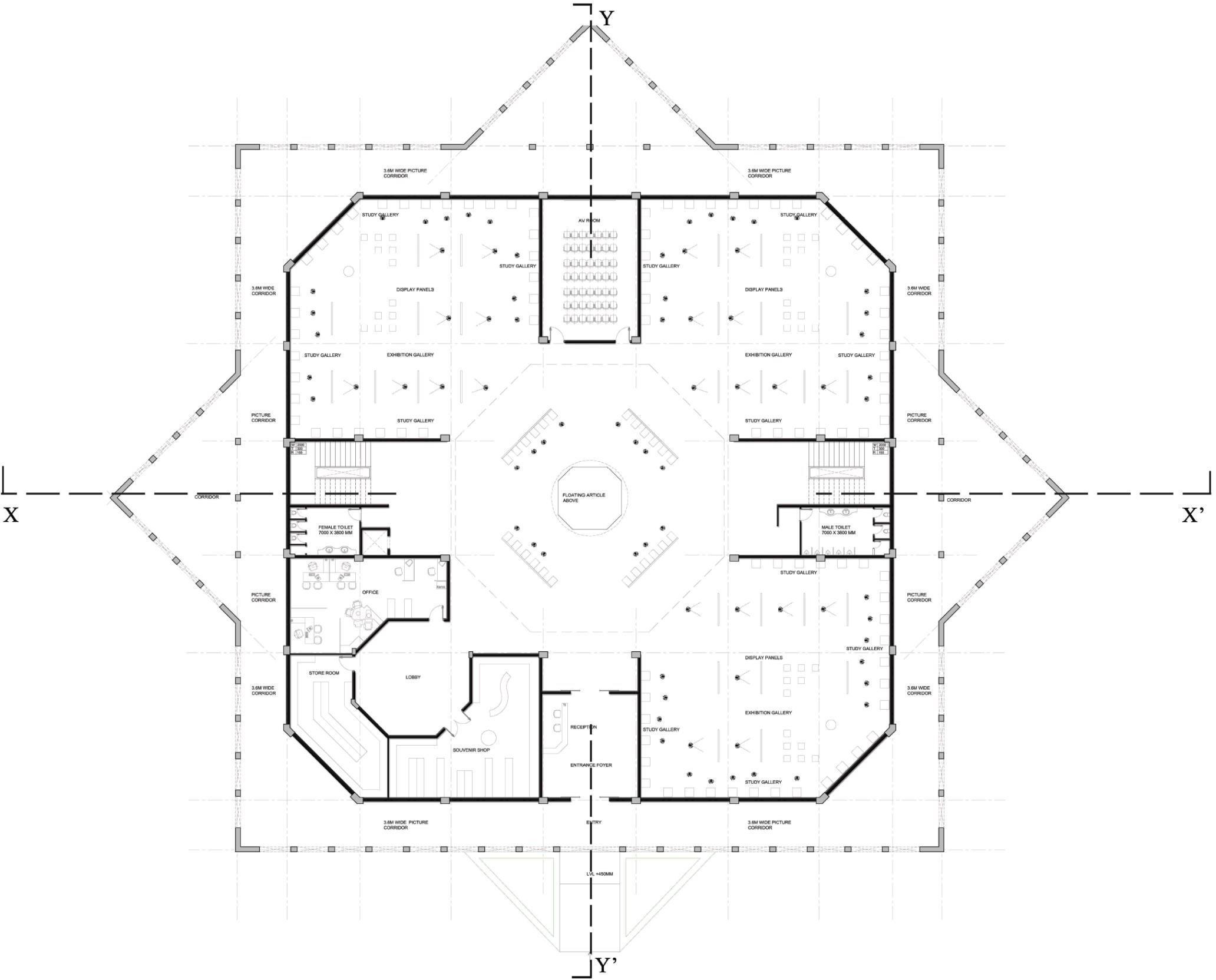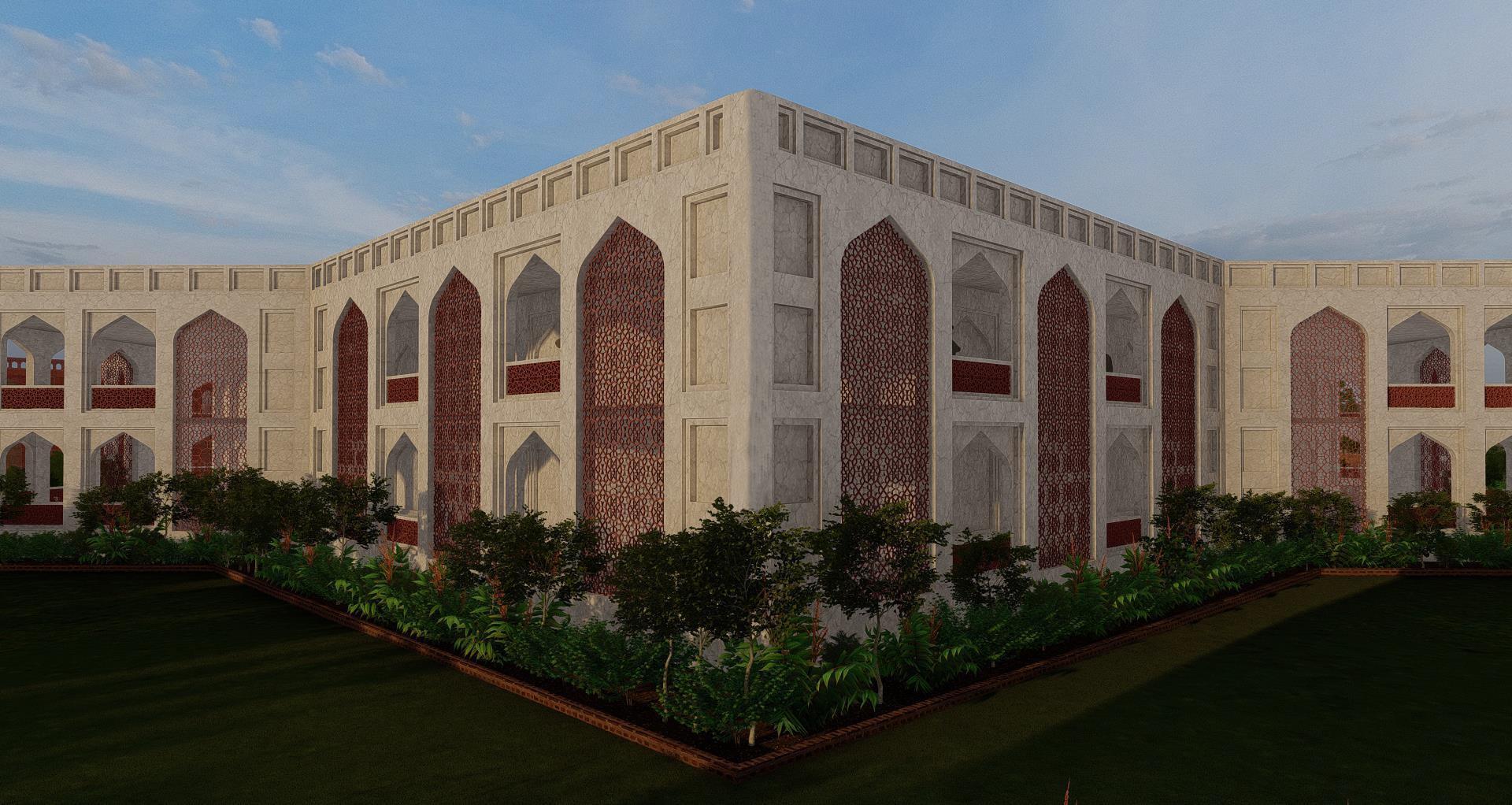 The outer star shape of this centre is inspired from one of the Islamic geometric patterns It is 8-pointed star, made of two squares, one rotated 45 degrees with respect to the other The exterior corridor has a continuous flow on all the 4 sides of the orientation centre It is 3 6 meter wide arched corridor The walls of the corridor serves as picture galleries Jaalis has been provided in the outer façade A harmony has been created in the outer elevation with the help of jaalis and arches. Contrast is provided by breaking the monotony of the colour.