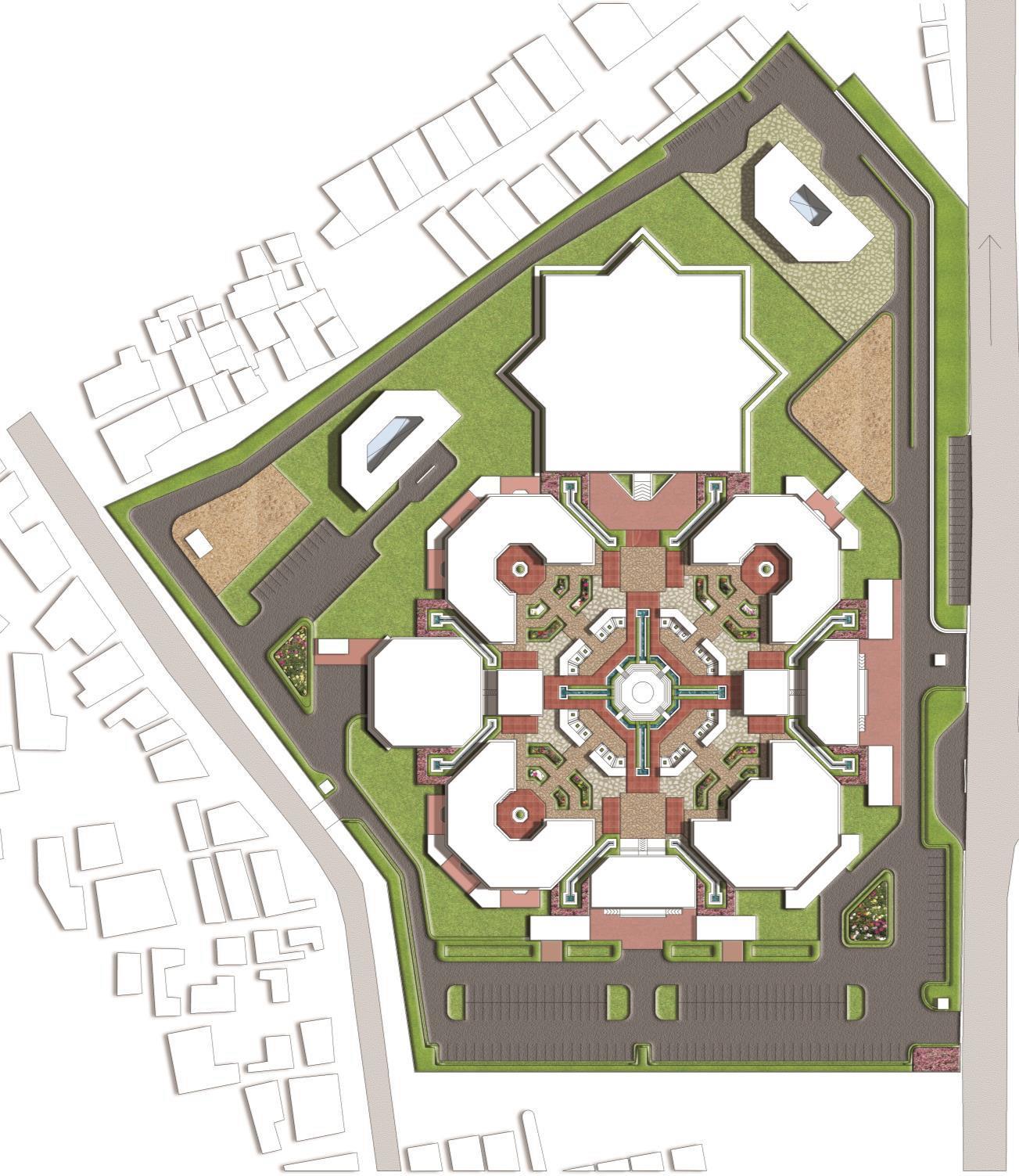 Basic planning of the site has been evolved from the plan of Taj Mahal which includes a central chamber octagon in shape and surrounded byoctagonal rooms