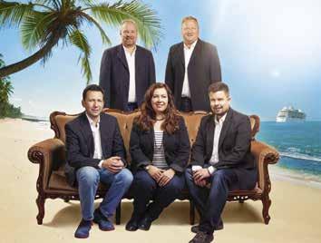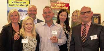 We Love Cruisesin henkilökuntaa ”Karibialla”. Kuvassa ylärivissä toimitusjohtaja Tony Pokkinen, varatoimitusjohtaja Harri Erho ja istumassa risteilyspesialisti Petri Korpimo, myynti- ja markkinointipäällikkö Jenni Luomala sekä risteilyspesialisti Atte Luomala.