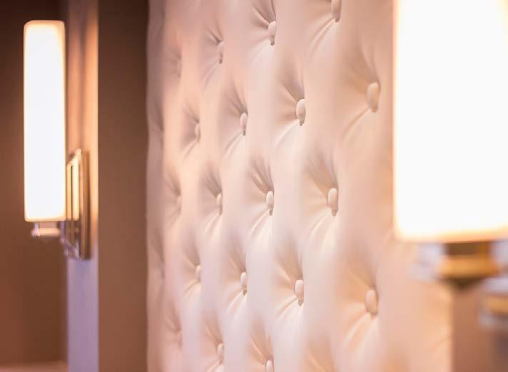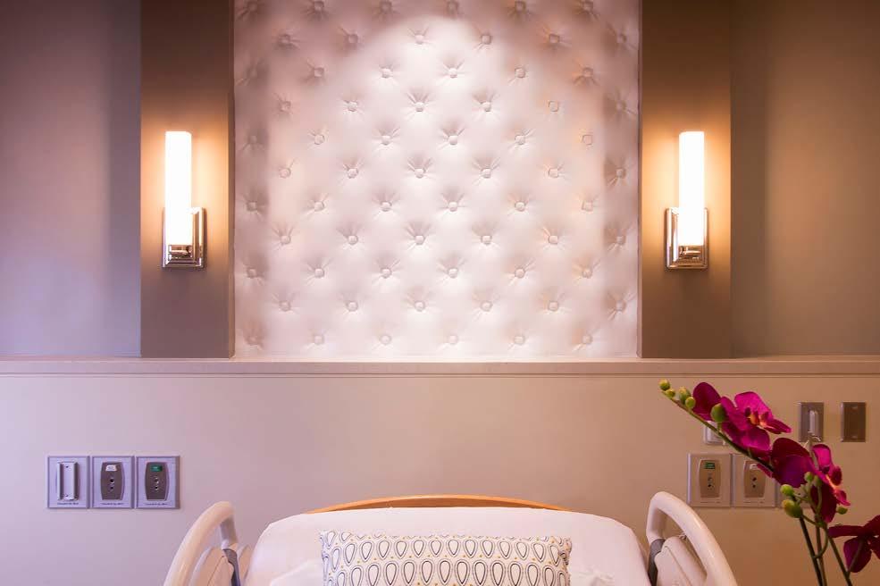 Simple elements such as glass mosaic tile and a tufted headwall panel create just enough pattern and subtle shadow to lend a feminine and elegant feel to this patient room.