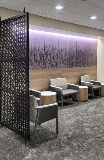 Directories should be three-dimensional and provide symbols that correlate with points of reference in the building. Strategically located artwork, feature walls, and accent colors can act as landmarks for patients following directions and circulating through the space.