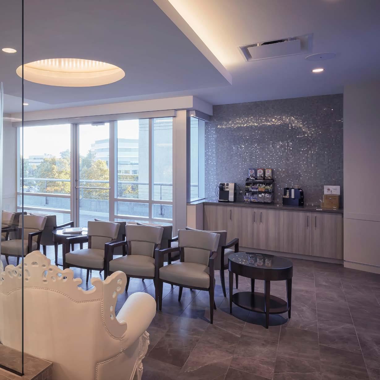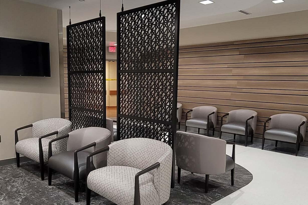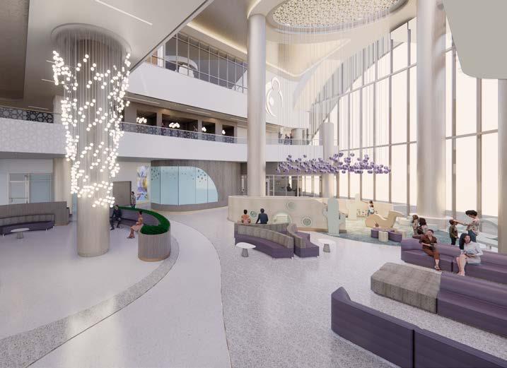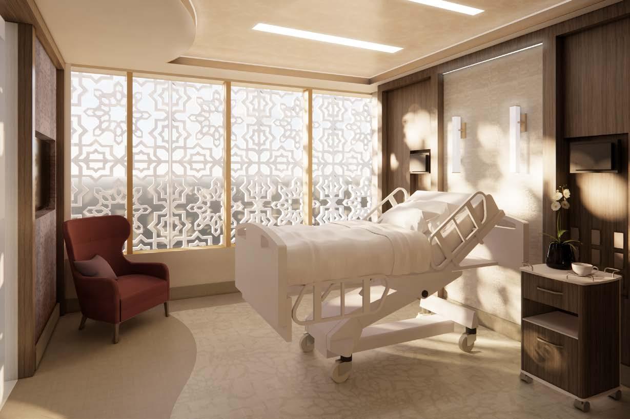 The interior design incorporates positive distractions and customizable elements to enhance the patient experience. Spacious public areas and elegant finishes offer a sense of luxury and serenity throughout the building. Neutral colors are accented with complimentary muted tones to add layers of richness. Soft light emanates from indirect coves and sculptural pendants of metal and glass. Decorative wall coverings and faceted metal details add a touch of sparkle and wonder. Natural daylight filters through exterior lace-patterned screens to control harsh glare and grace the interiors with an intricate pattern of shadow and light. Luxurious patient rooms offer multiple lighting options to give patients and families a sense of control.