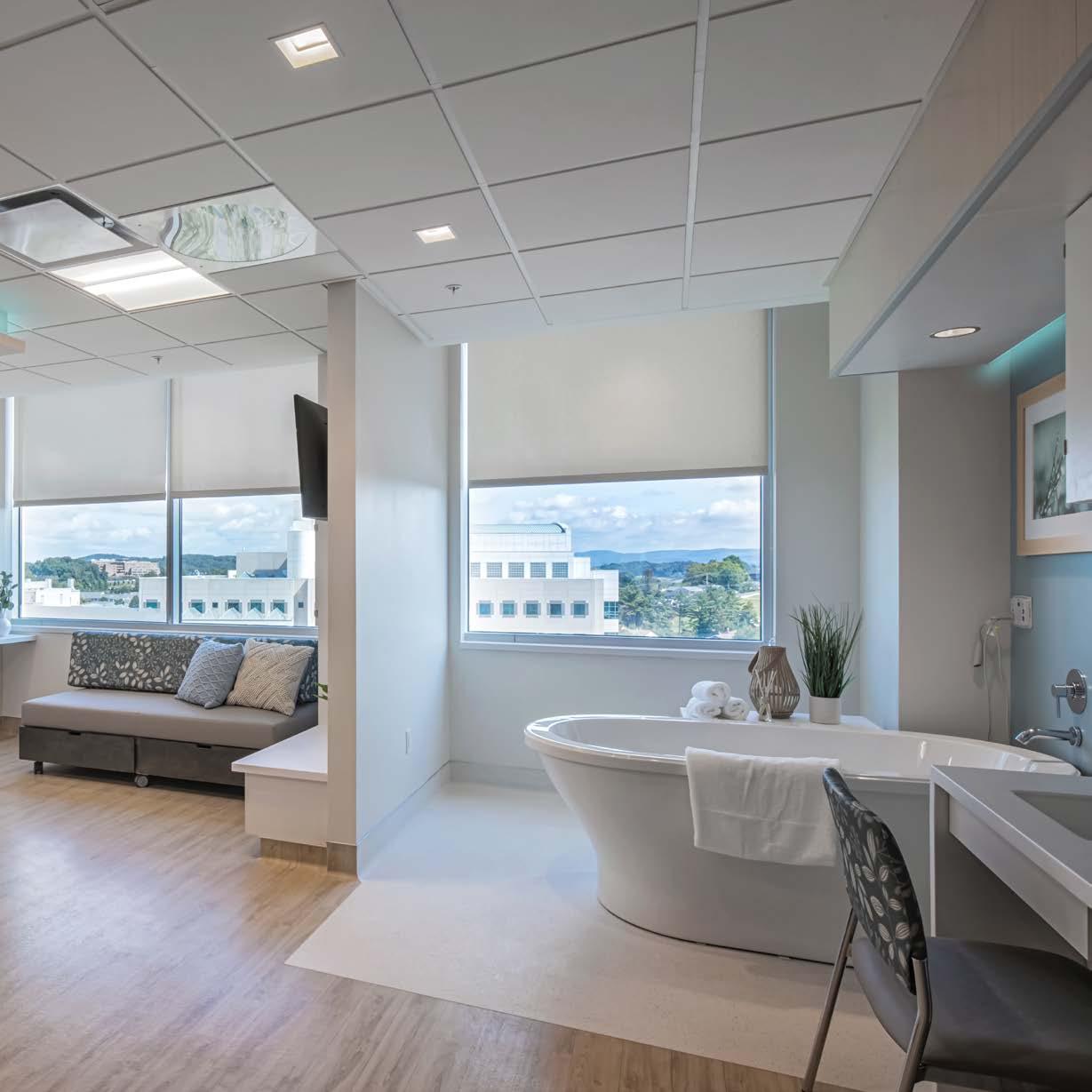 The Birthing Center is dedicated to the embrace of new life. Offering Obstetric care in a comfortable spa-like environment, this facility supports the needs of families as they welcome their new addition. Multiple approaches to laboring and delivery are available to those giving birth, including water labor options. Unimpeded access to triage rooms is available directly across from the elevators to assess labor progression. Should medical conditions necessitate, fully equipped C-Section rooms are embedded on the floor to reduce travel distance. State-of-the-art newborn medical support is also available to handle all situations quickly and effectively. Patient rooms support immediate bonding of the newborn with space for both the baby and the partner. Calm colors encourage stress relief and mountain vistas supply positive distractions. Challenging pregnancies are located in a separate area of the floor so those conditions can be managed with little distraction.