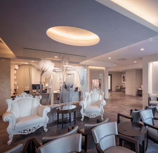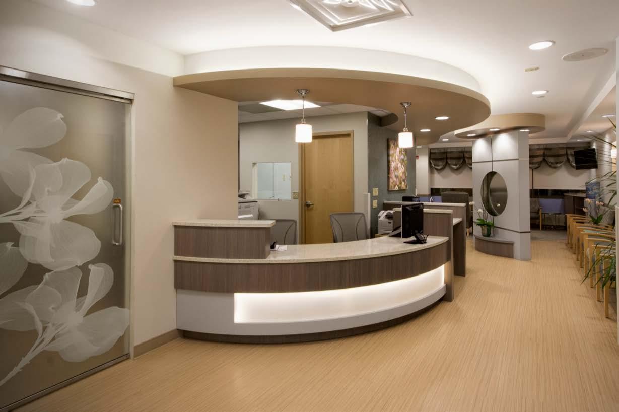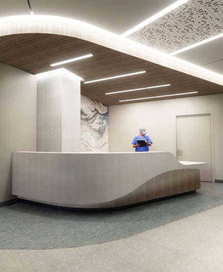 Plaster panels in the lobby reflect light and cast shadow, highlighting a curved flower petal relief that changes as the patient moves through the room. The subtle contrast of wood grain wall panels and gray veins in the white marble reception desk pique the senses as female patients scan the space.