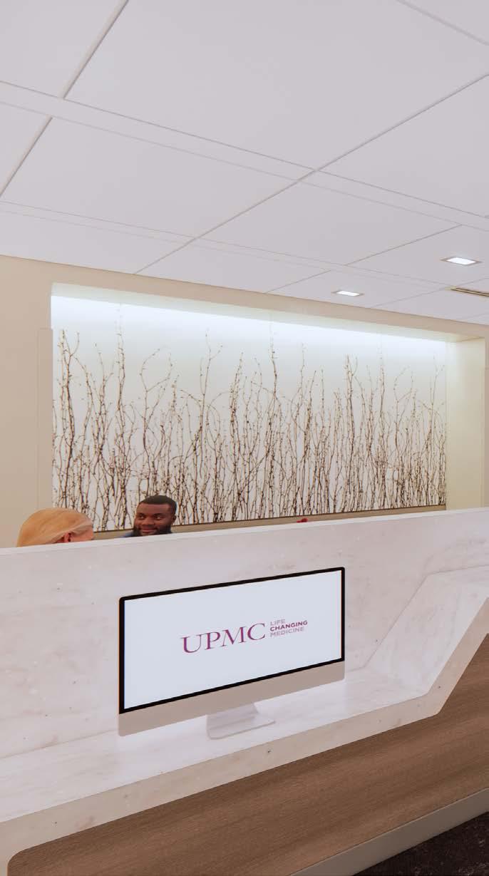 UPMC Passavant updated their Centers of Excellence in order to establish a welcoming first impression and improve overall patient experience. During the design process, IKM evaluated patient entry flow, waiting and registration needs, and life safety plans to optimize patient and staff circulation. The updated layout allows visitors to easily and comfortably navigate the Center. The front door experience was refreshed with a newly developed design aesthetic. Signage and landscaping were added at the main entrances to the Hospital for a clear and friendly arrival experience. A new set of interconnecting stairs between the main registration area and the cafeteria on the lower floor create a convenient pathway for patients and staff. Digital content was incorporated into the design to prominently display Hospital donors, history, and staff recognition. The Magee-Women’s Specialty Services Clinic, a Center of Excellence offered at Passavant Hospital, was also updated as part of this project.