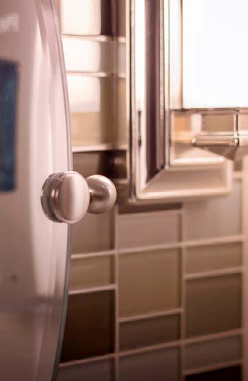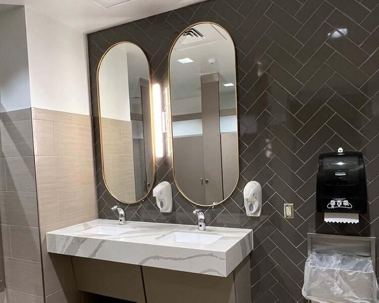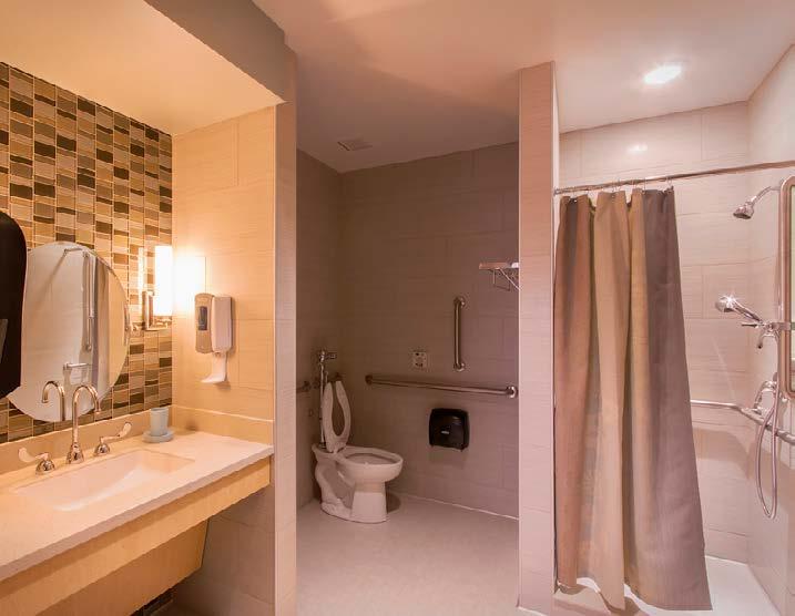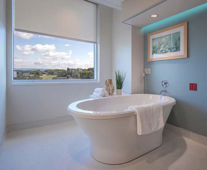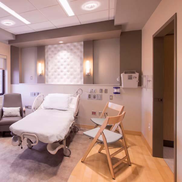 Interior design details transform the patient room from a clinical space to a temporary home for growing families. Warm wood tones and neutrals are illuminated by elegant light sconces. A decorative ivory wall cover adds soft texture to the space, drawing the eye and bringing a boutique feel. Flexible seating options can be included or removed to accommodate family and friends. The spacious private bathroom matches the luxurious finishes of the patient room. Shimmery tiles backdrop the round mirror above the sink, softly lit from either side. The toilet and full shower are easily accessible for new parents.