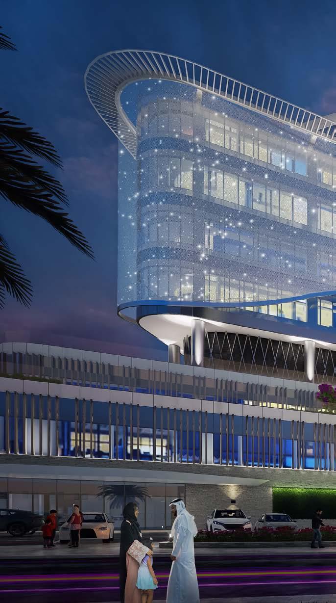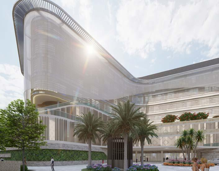 The exterior façade has a modern, curvilinear, and contemporary style, with a feminine mashrabiya-inspired metal veil draped preciously over the upper levels to soften the harsh glare of daylight while reflecting the character of the women within its walls. Materials were selected for simplicity and strength, in a warm neutral palette. Ivory and gray stone and champagne metal slats bring texture to the façade, while gently curving canopies shade pedestrians from the sun. At night, the building appears to glow softly. Lighting design accentuates the beauty of the hospital and ensures safe passage for visitors entering and exiting. Subtle LED lights shine delicately across the lace veil, mimicking the night sky and changing color for special occasions.