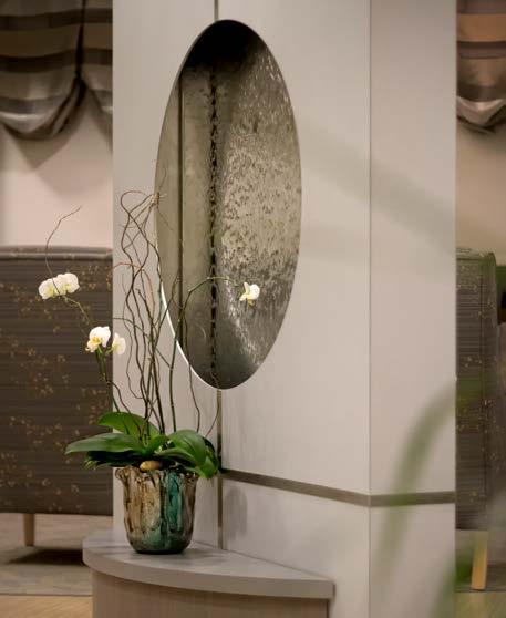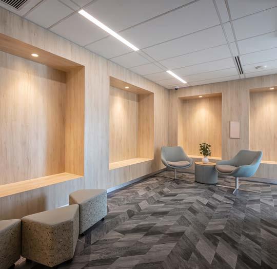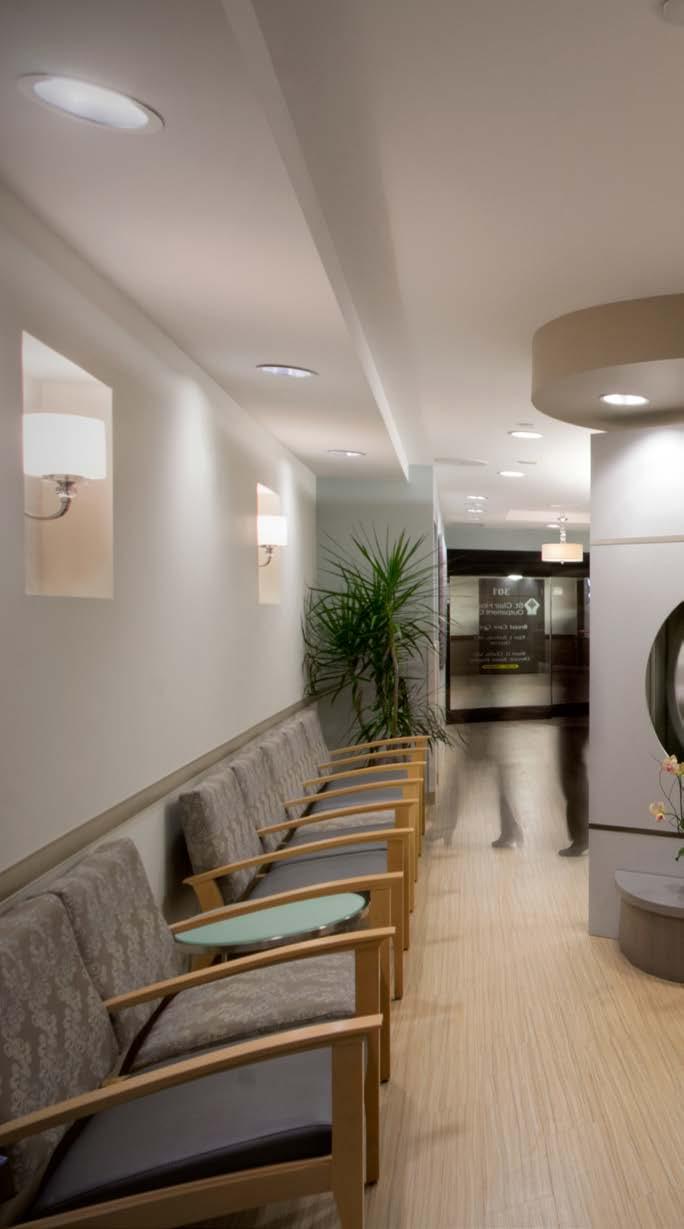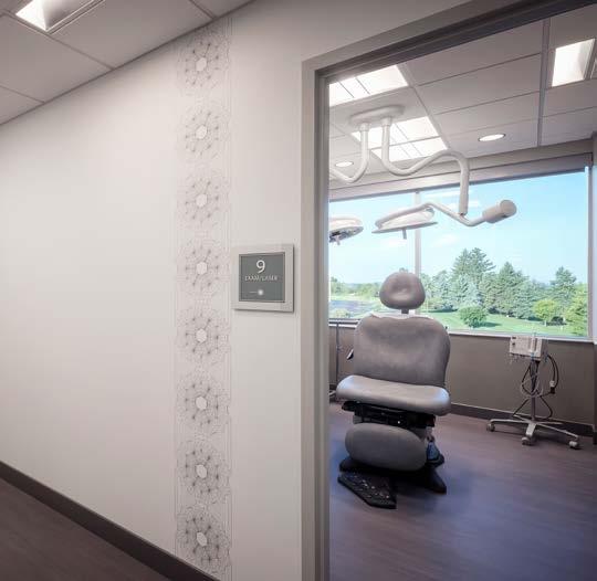 A gentle water feature emits a sound reminiscent of a flowing stream to soothe and relax patients. It also acts as an additional source of white noise to mask unexpected personal conversations at reception.