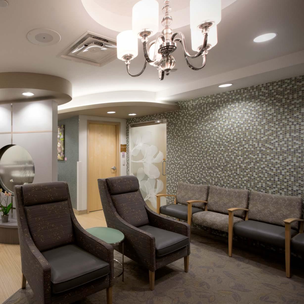 Organic and biophilic elements promote a serene atmosphere throughout the Breast Center. Patients are greeted with a softly curving reception desk mirrored by the rounded bulkheads above. The gentle water feature trickles soothingly and doubles as white noise for privacy. Subtle details in the recessed light sconces and reflective wall tiles bring positive distraction and femininity to the space. The glass doors between the waiting room and clinical spaces are embellished with a translucent dogwood flower graphic to preserve privacy. Corridors beyond are offset to further obstruct views from the public area. The soothing palette of muted colors and wood tones is accented with soft shades of blue and green.