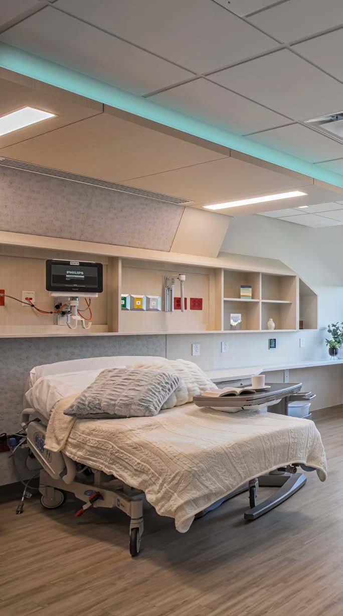 The freestanding West Virginia University Medicine (WVUM) Children’s Hospital supports the delivery of highly specialized care for the kids of West Virginia and beyond. This 155bed, eight-story pediatric bed tower, women’s pavilion, and medical office building connects to the Heart and Vascular Institute on the campus of Ruby Memorial Hospital in Morgantown. The main entry is a grand, multi-story, light-filled space that welcomes one’s arrival with calming tones and clear wayfinding. It includes places of refuge such as a café, gift shop, multi-faith chapel, and pharmacy. Patient rooms begin on the sixth floor, offering stunning vistas of West Virginia’s mountainous topography. The design offers the patient and family control of room lighting including color and ambiance through manipulatable LED light fixtures. On the seventh floor, the NICU has flexible rooms to accommodate multiple birth events for families gifted with twins, triplets, or quadruplets. The eighth floor houses the Obstetrics Unit, with LDRP rooms, post-partum rooms, and antenatal rooms.