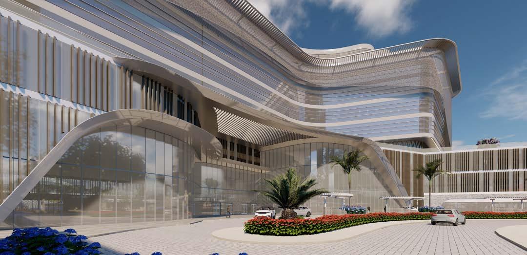The building exterior is rich with pattern and texture. Every edge and canopy forms a sweeping curve reminiscent of lines found in nature, creating a soft and subtle presence. Live walls of greenery and stone veneer at the lower podium level continue the organic theme.