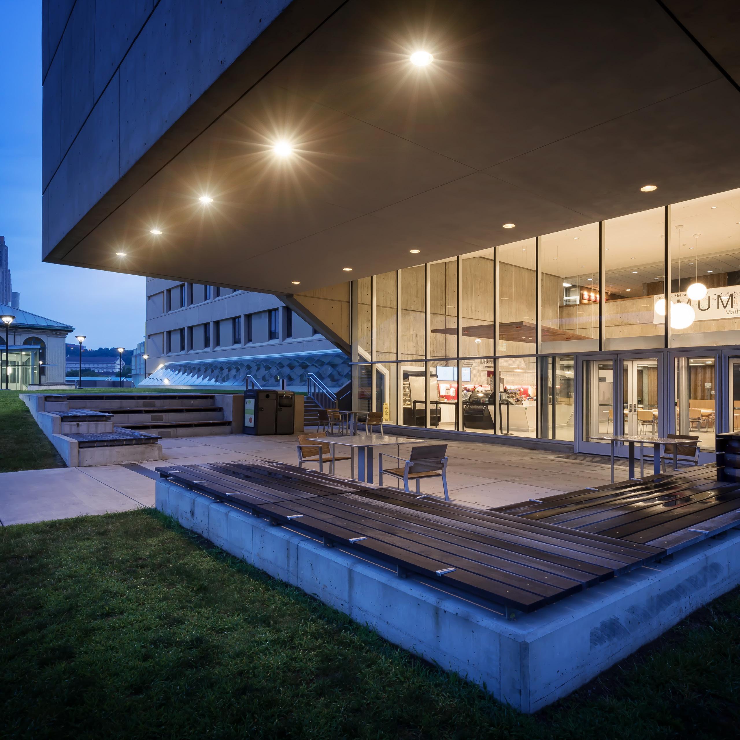 This on-campus cafe consists of two micro-restaurants, a soup and sandwich kiosk, and a coffee concept. Each micro-restaurant has its own kitchen, and common back-of-house areas accommodate a receiving area, storage, utilities, waste and recycling, and an office. The coffee concept and two micro-restaurants are massed and arrayed to identify each as a unique venue within the whole. The coffee concept anchors the corner of the site and addresses pedestrian circulation from the Fine Arts Plaza diagonally across South Eleventh Street.