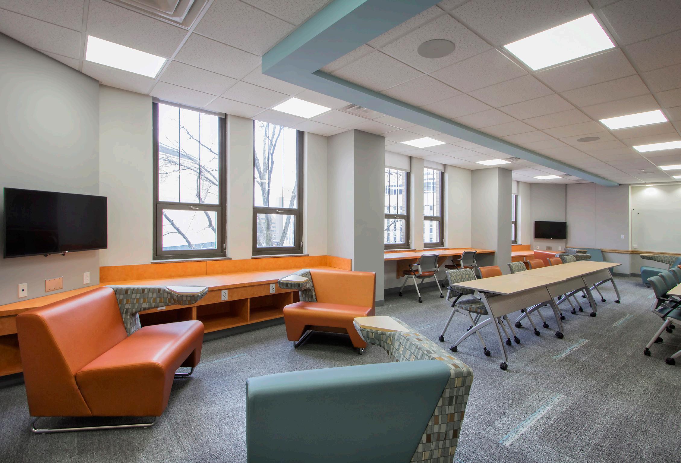 Left: A renovated area at CMU Mellon Institute's Collaborative Habitat provides areas to touch down for nontraditional students and commuters.
