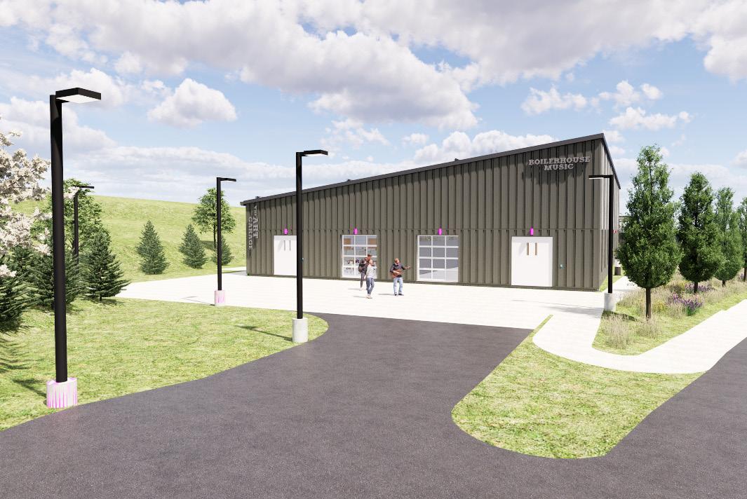 Left: The PEMB houses an art studio and a band practice space. Garage doors to both spaces open onto a paved area that allow the program to spill out on nice days. The plaza will also host University-wide events.