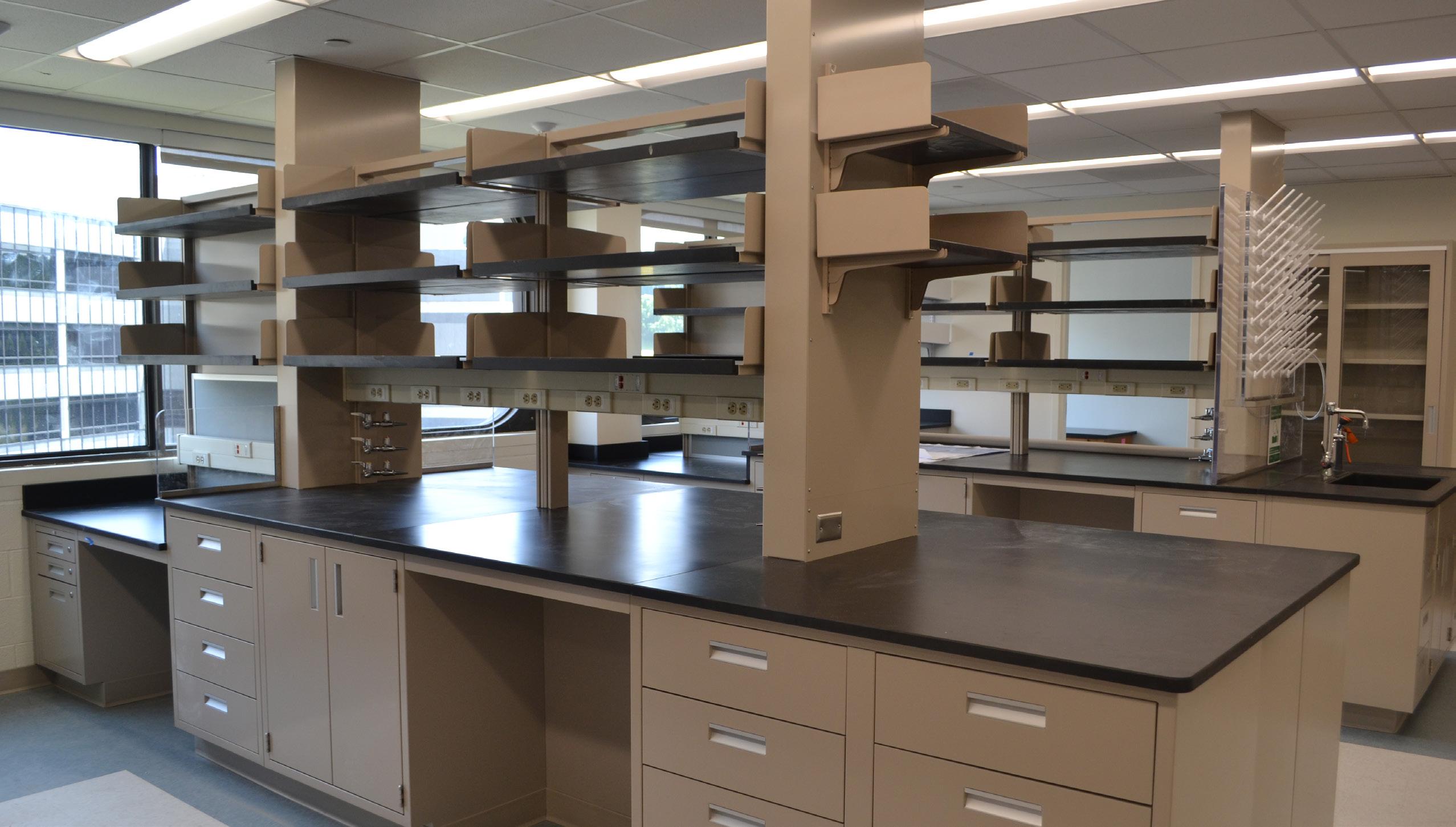 Above: Each bench is equipped with laboratory gas, power and data ports, useradjustable task lighting, and adjustable height desk space for write-ups and seated computer work.