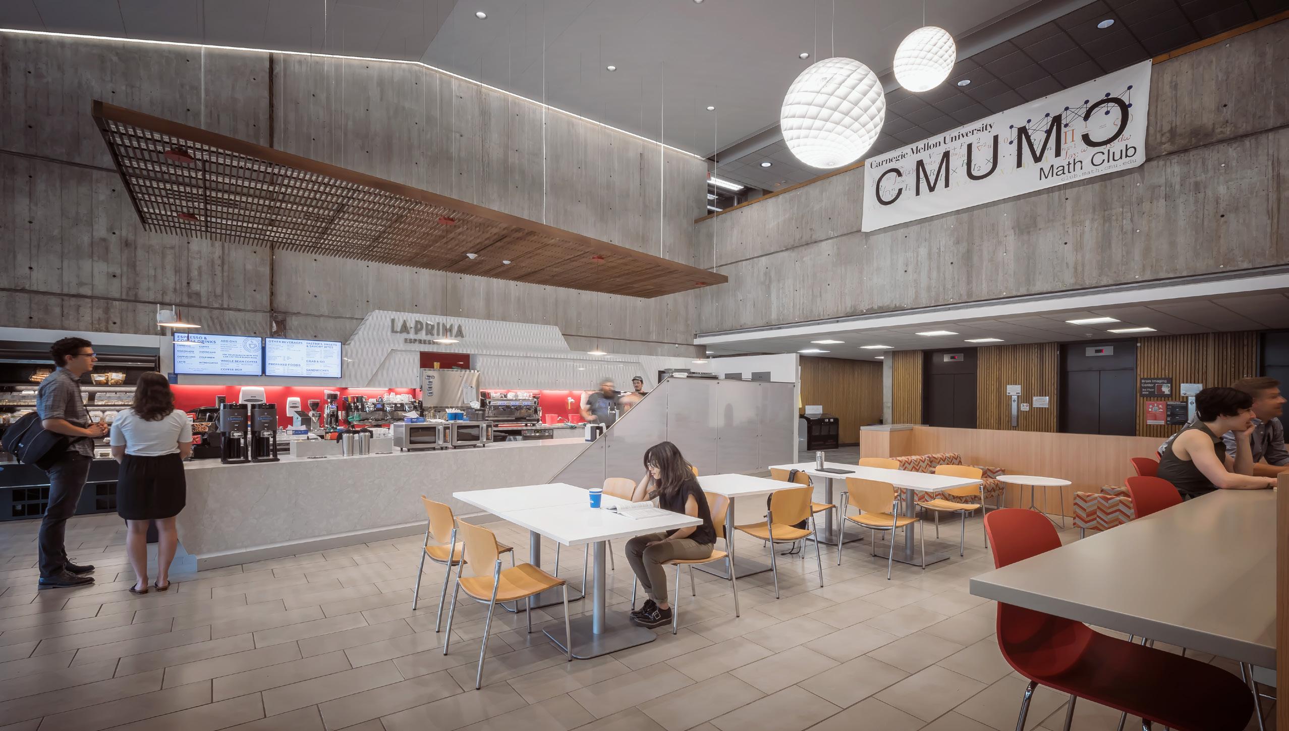 Above: This renovation to CMU's Wean Hall, a Brutalist style building from the 70s, provides a new gathering space within the existing building. A cafe serves as a wayfinding landmark within the floorplan.
