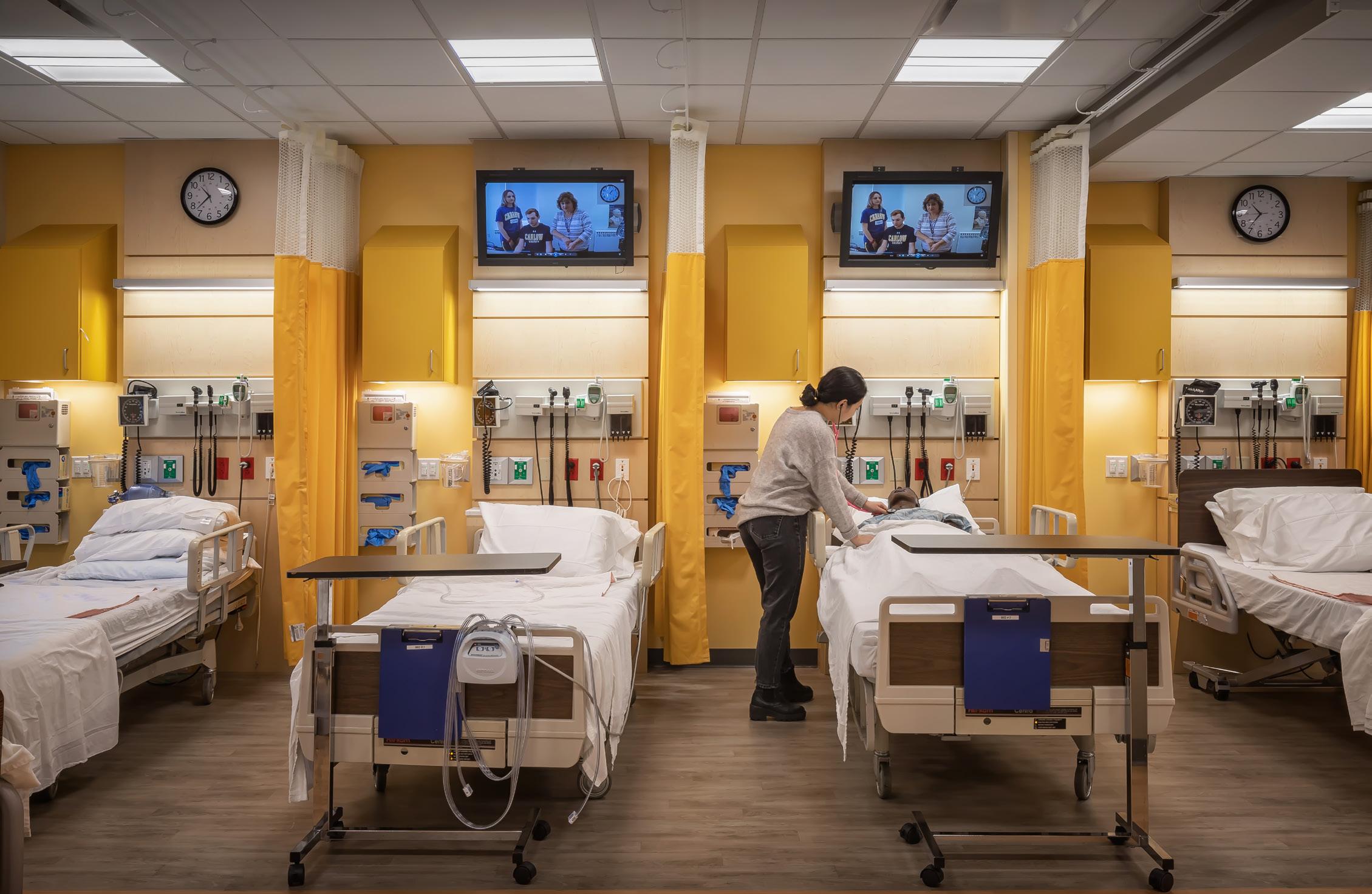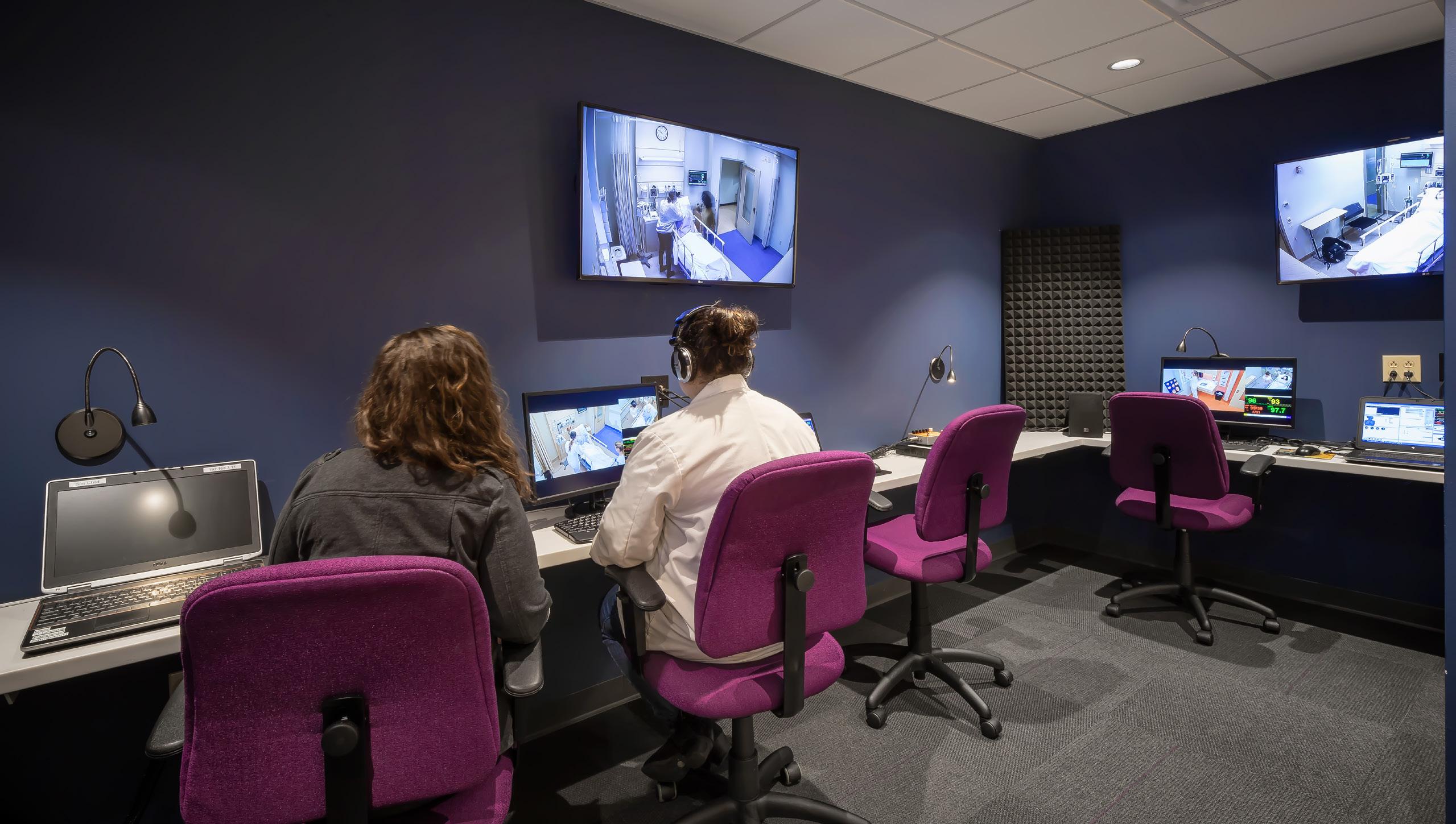 Below: IKM's extensive healthcare planning and design expertise enabled us to establish an authentic clinical simulation teaching environment. Each simulation lab features a digitally manipulated mannequin, controlled by instructors in the command center, accurately presenting specific symptoms for student response.