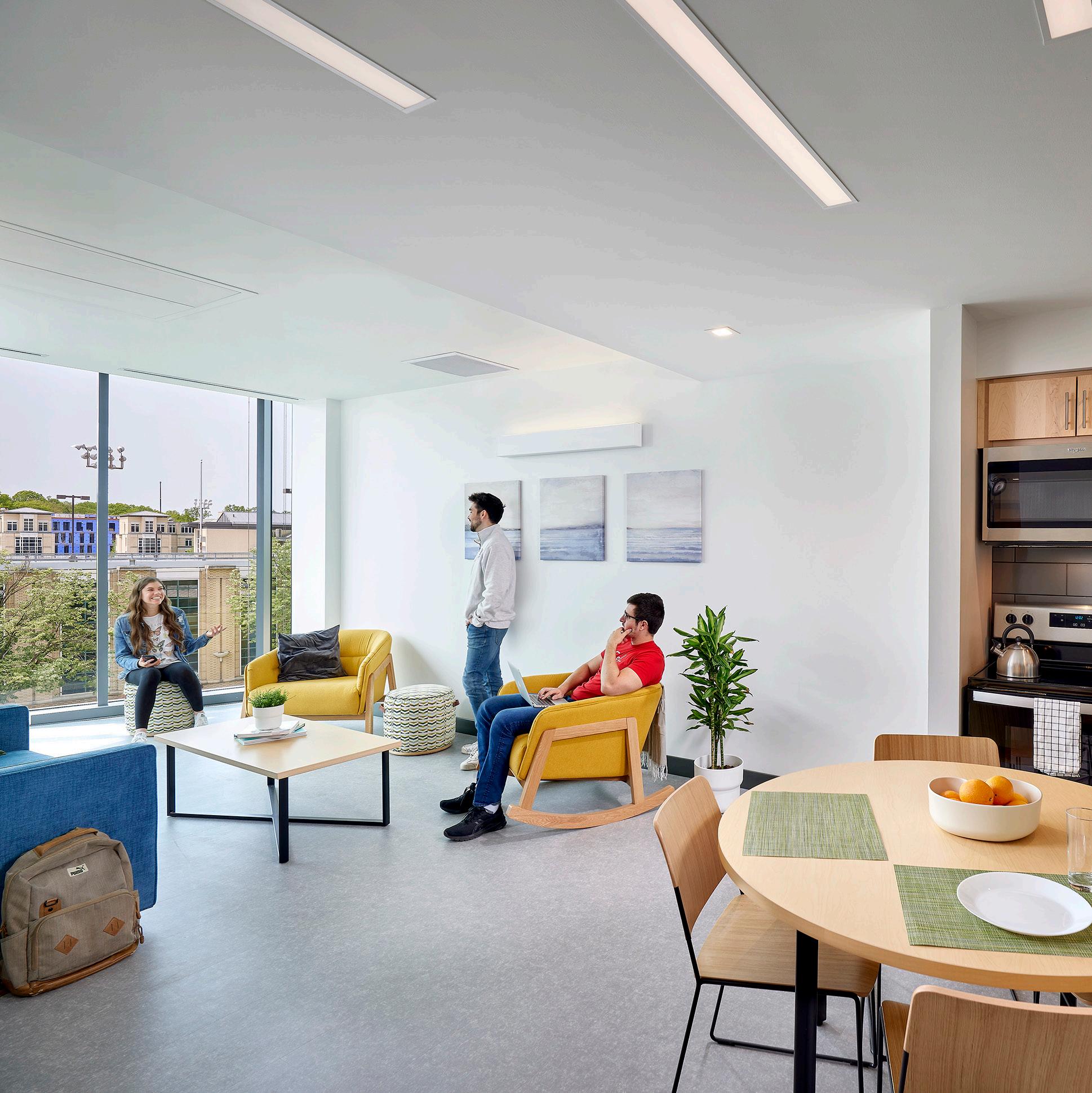 Below: The Forbes Beeler Apartments at Carnegie Mellon University (CMU) was designed with equity in mind and accommodates a variety of rooming preferences. Stakeholder engagement sessions determined that each unit would be equipped with two kitchens and bathrooms so students share with a maximum of four others. A common living and dining space is the central social feature of the unit.