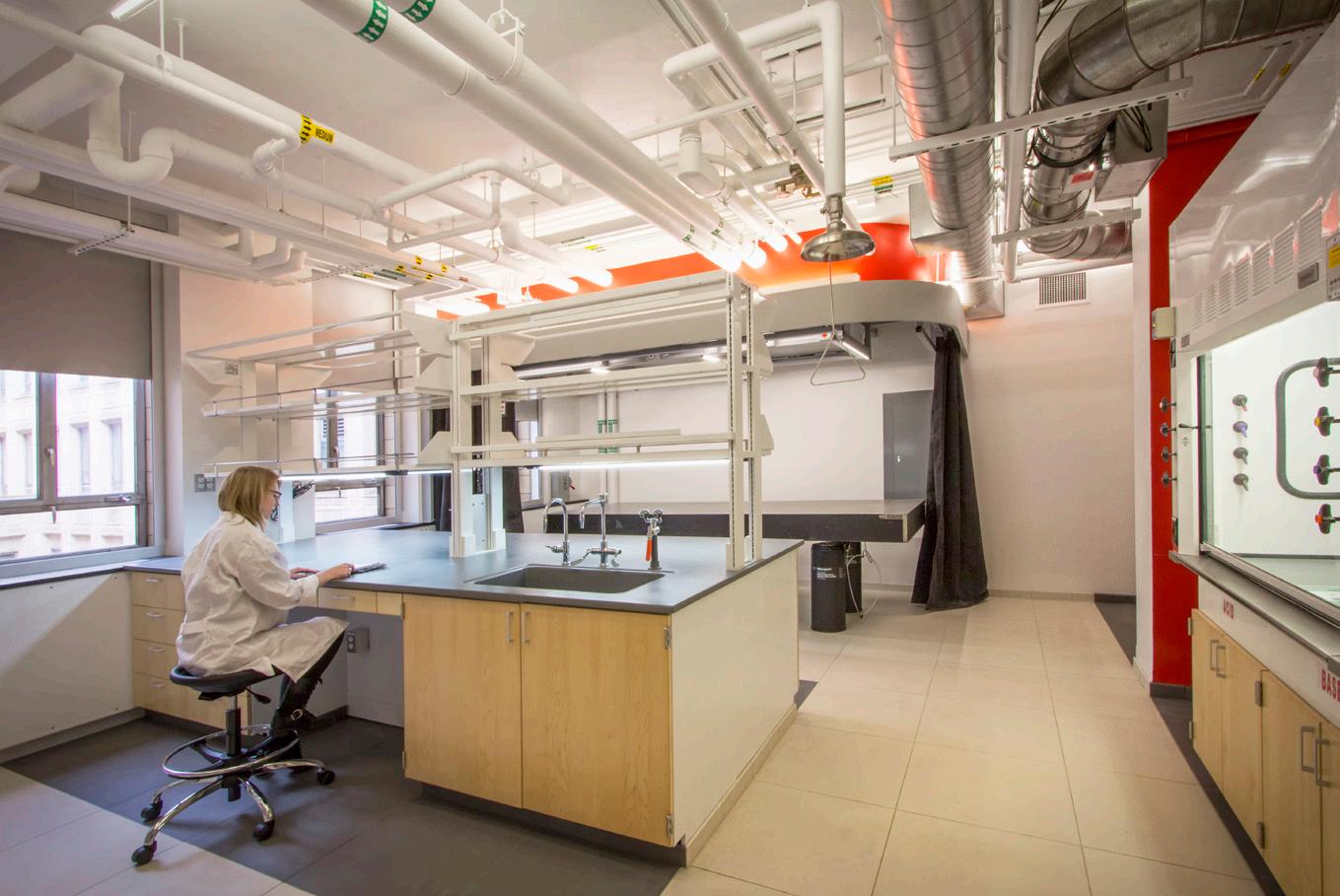 Left: This collaborative “ballroom” style environment allows for plenty of modular bench space for individual projects, shared equipment space within the lab, access to sinks, chemical fume hoods for flexibility, and features such as drench showers and emergency eyewash stations.