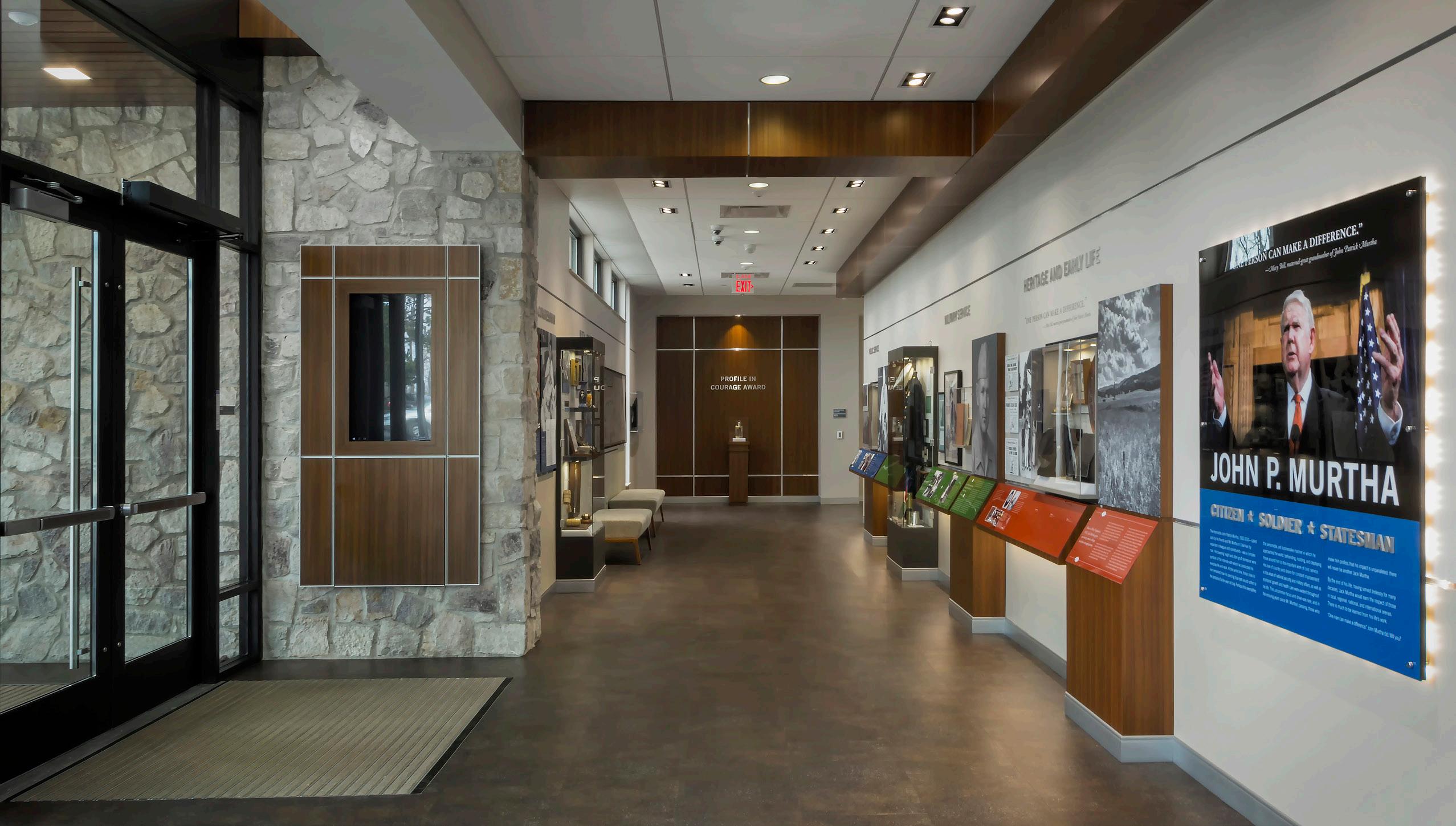 Above: The building houses an interactive gallery depicting the life of Congressman Murtha. A veteran's lounge honors Murtha's military service while supporting the academic pursuits of veterans currently enrolled on campus.