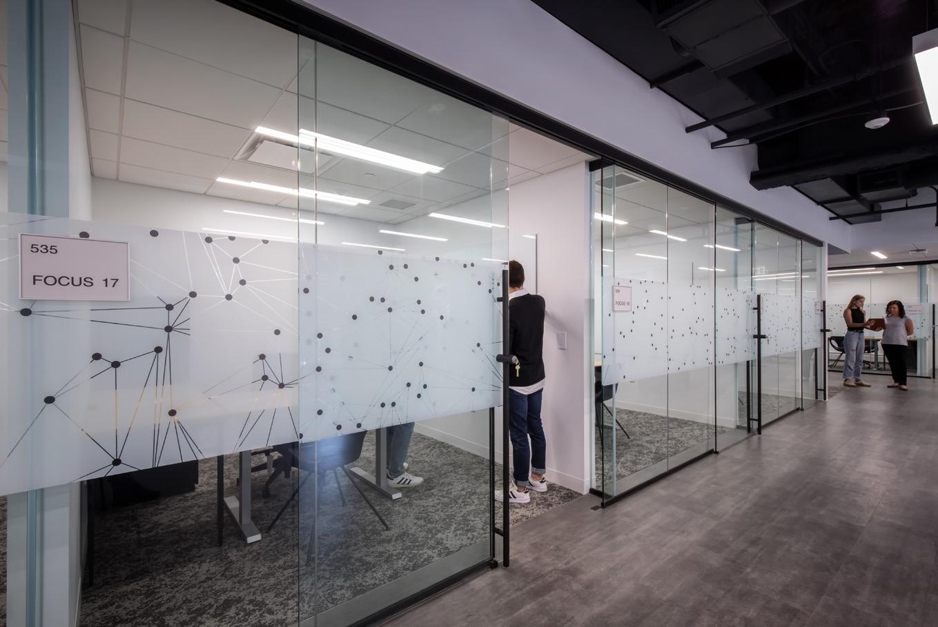 Left: Interior and graphic designers collaborated to create a film for focus room glass walls, ensuring privacy with natural light. The pattern draws inspiration from the computer science concept of "distributed minimum spanning tree."