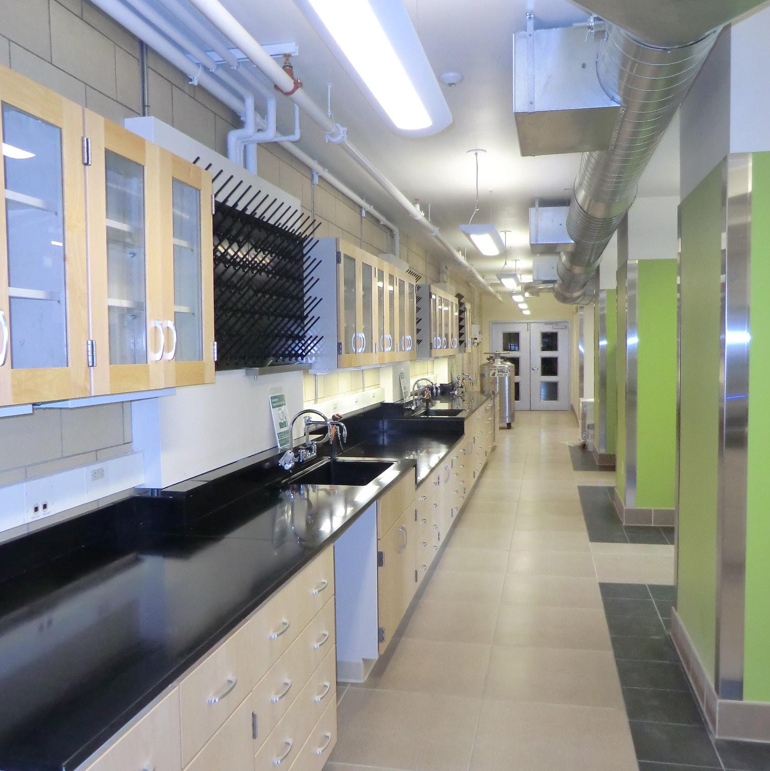 The architecture of the space capitalizes on the high ceilings and windows available. The extensive exhaust system required was integrated into the design to meet specific exhausting and ventilation needs while also allowing maximum daylight into the space.