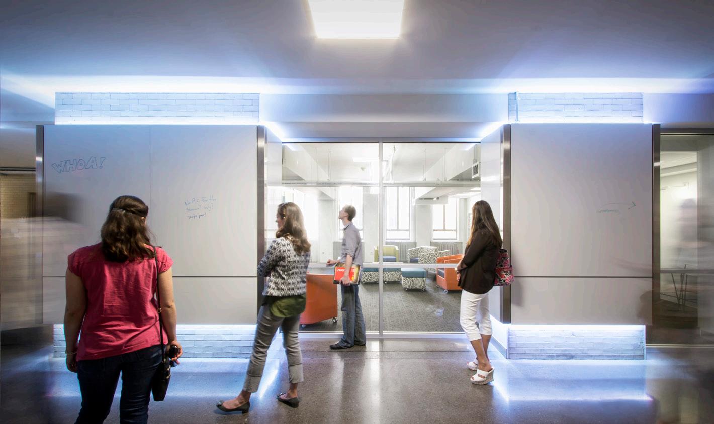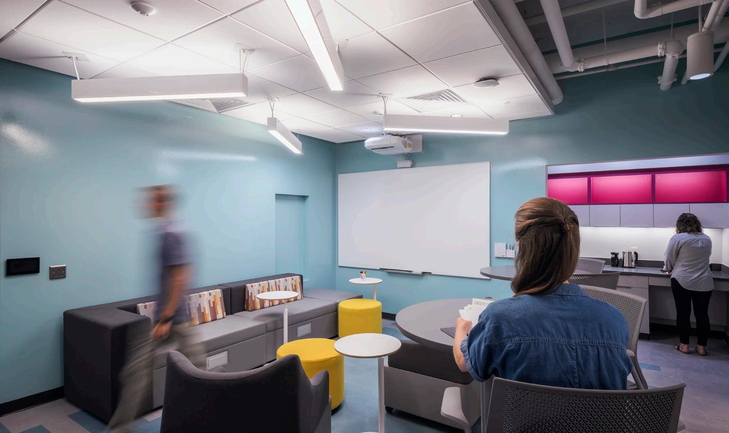 The design infuses the space with natural light; interior walls were removed to connect the space to existing light wells to flood the collaboration room with daylighting and views to the outside. Lighting design infuses dark corridors with creative techniques to enliven the space and foster collaborative energy.