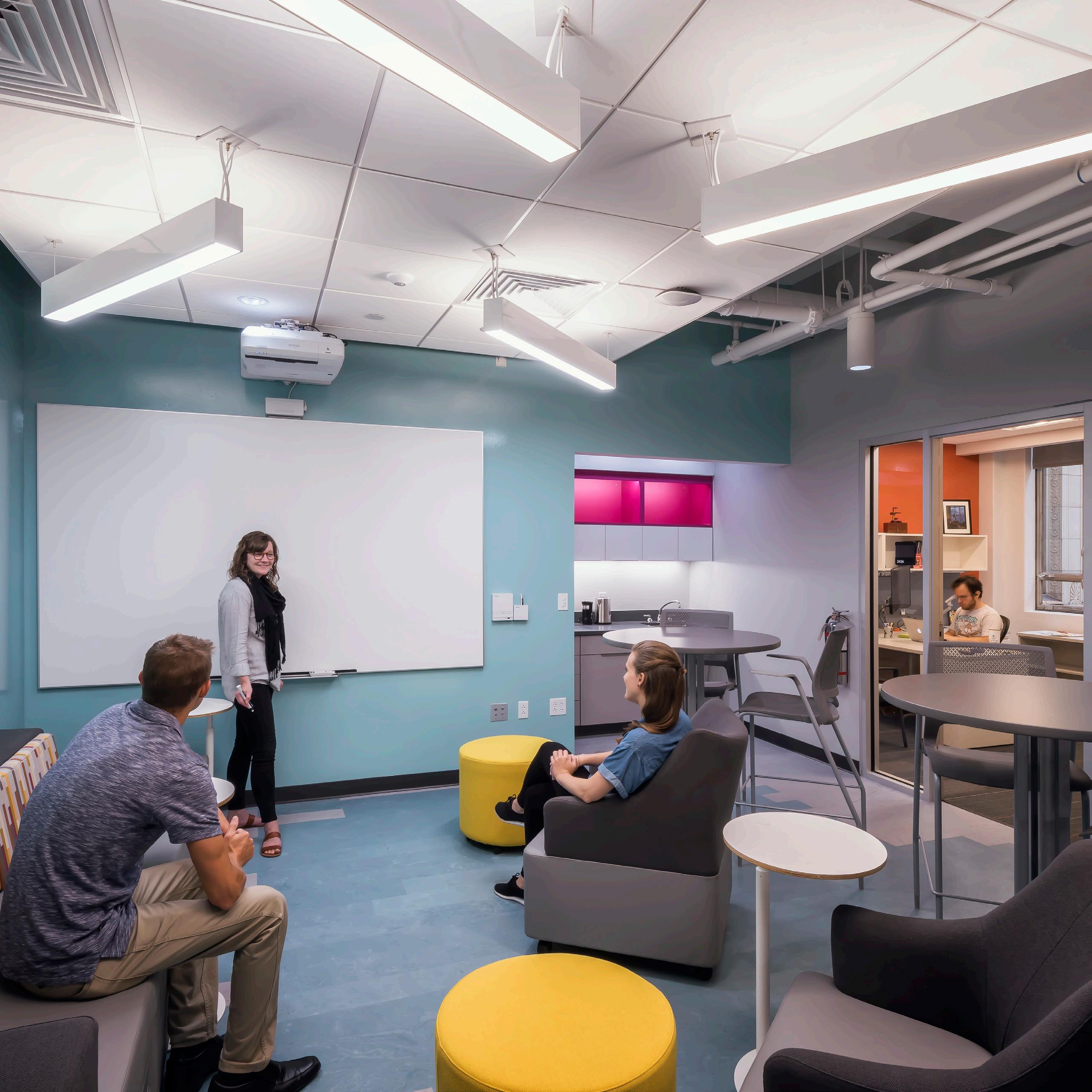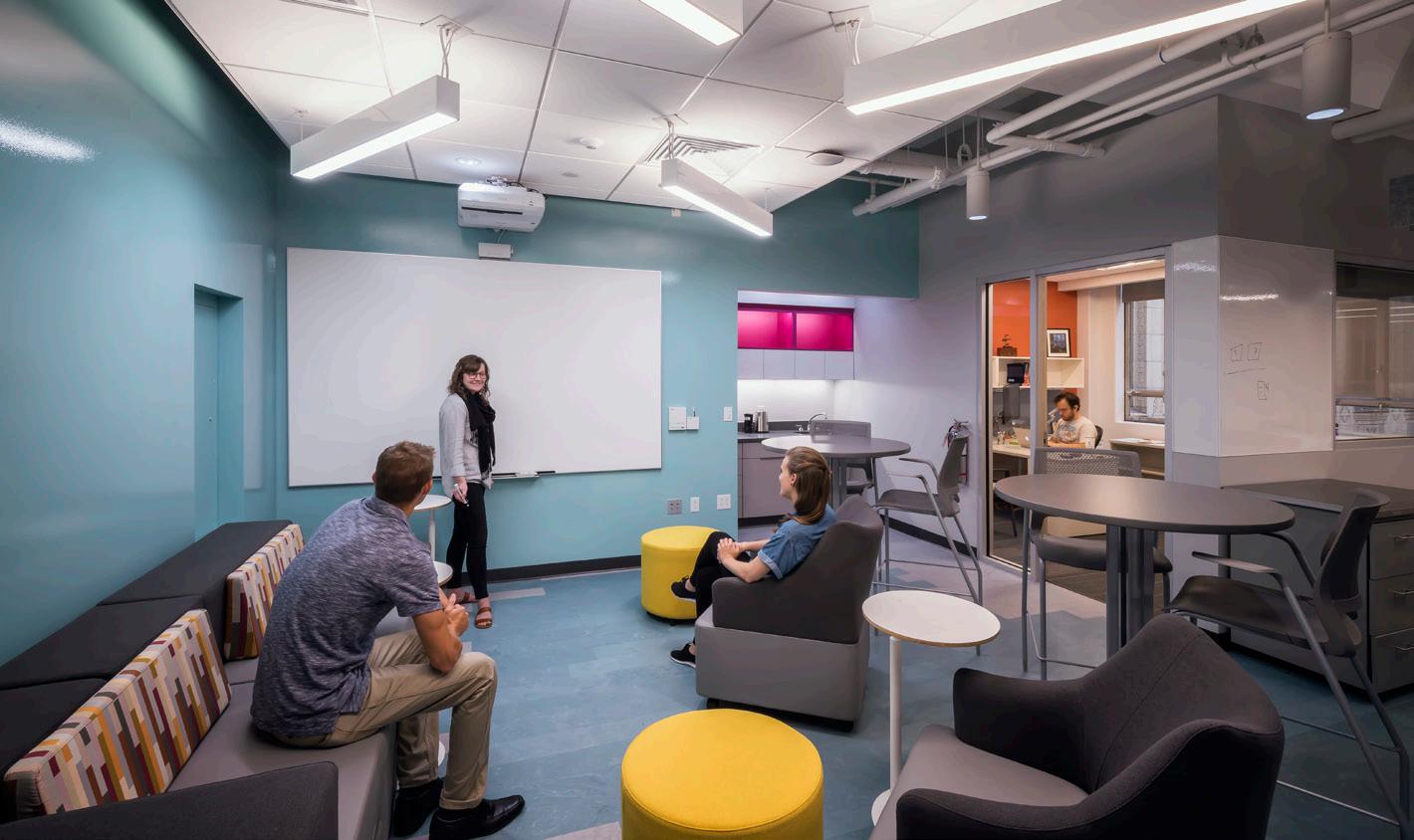Derived from an IKM-led planning study as one of the projects for the renovation of Carnegie Mellon University’s Mellon Institute, the collaborative habitat project evolved from an initial concept to an innovative design to engage science students. The result is a dynamic space that fosters gathering, promotes informal social collisions, and provides opportunities for collaborative research interactions. Originally conceived as a collaborative lab, the space evolved to comprise a gathering room and the revitalization of a well-used corridor. The collaboration room includes flexible furniture that can be rearranged as groups come and go.